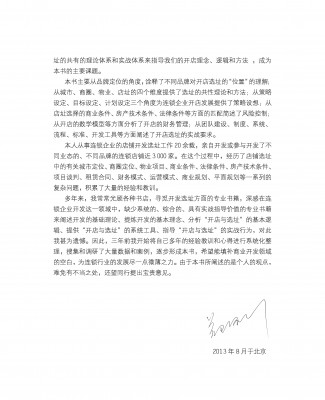 該書是一本介紹商業(yè)選址的書籍,我相信商業(yè)品牌拓展經(jīng)理定然不會錯過。但是,我想在這里重點推薦給商業(yè)地產(chǎn)開發(fā)商們,希望此書能成為你們的必修課教材。因為“訂單開發(fā)”已經(jīng)成為商業(yè)地產(chǎn)界的一個公認法則,也就是在規(guī) 劃定位之前開發(fā)商必須提前了解商業(yè)選址的要求。唯有如此,才能避免盲目開發(fā),造成不必要的空置與浪費。是為序。