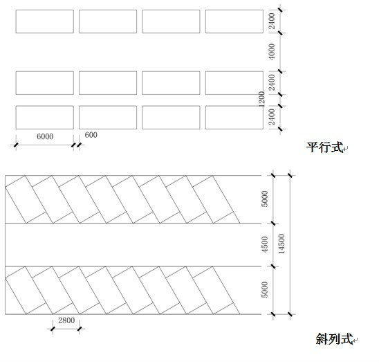 4.停車場(chǎng)的停車方式,根據(jù)地形條件以占地面積小、疏散方便、保證安全為原則,主要停車方式有平行式、斜列式、垂直式三種。其中間最小距離以小型車為例,停車方式見(jiàn)下圖