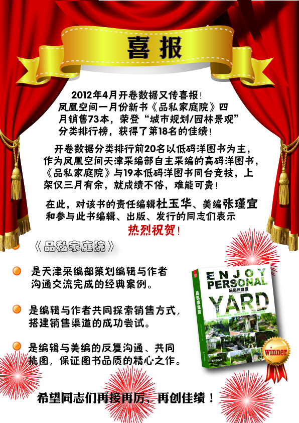 2012年4月開卷數(shù)據(jù)又傳喜報!鳳凰空間一月份新書《品私家庭院》當(dāng)月銷售73本,榮登“城市規(guī)劃/園林景觀”分類排行前20名!