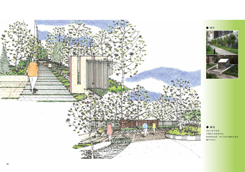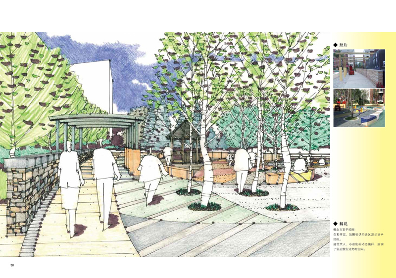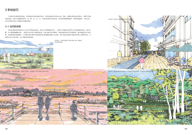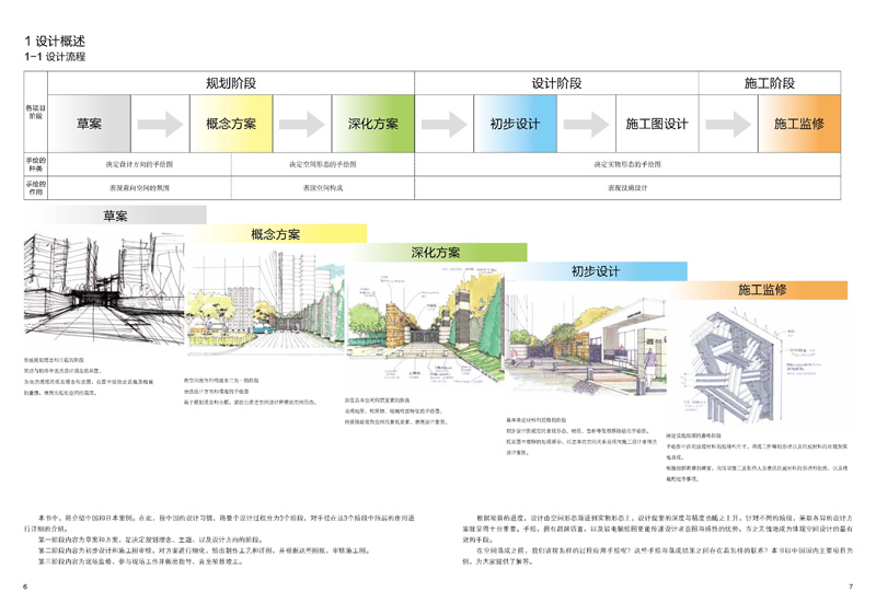 2. 國(guó)內(nèi)手繪類景觀作品集較多,但層次不一,比如諸多手繪入門及技巧分析的教程,內(nèi)容多過(guò)于單調(diào)。而本書不同于已有圖書,重點(diǎn)在于依據(jù)設(shè)計(jì)的自然階段,講解手繪效果圖的意義和技巧,具有更強(qiáng)的參考指導(dǎo)意義。