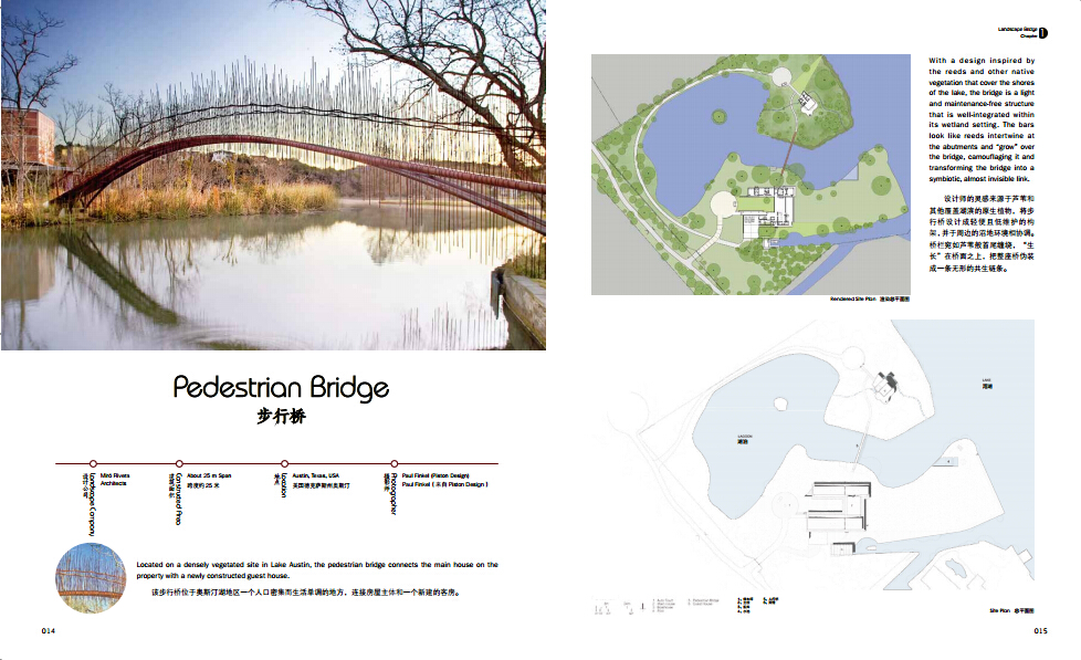 橋作為一種連接水陸的交通要道被人們所熟知,但人們對橋的關注卻多拘泥于用途。而本書中所輯錄的景觀橋向我們呈現了一個完全不同的概念,即橋也具有文化和視覺上的特殊魅力。完美獨特的橋體造型,精美實用或高科技的裝飾材料,絢麗的燈光照明等。