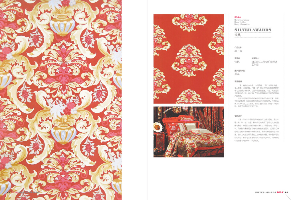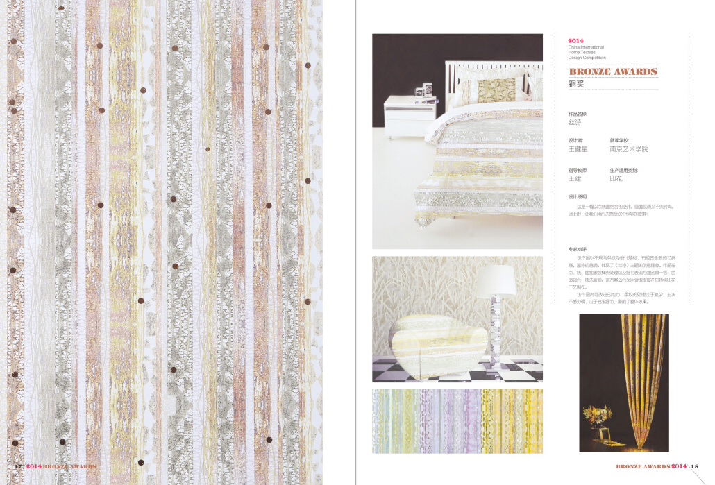本書收錄大賽評委會評出的金獎1名、銀獎3名、銅獎5名、優(yōu)秀獎30名、最佳創(chuàng)意設計應用獎5名,最佳設計創(chuàng)新意識獎、最佳設計題材獎、最佳手繪技法獎、最佳傳統(tǒng)紋樣表現(xiàn)獎四個獎項各兩名,共52件作品,全面展示,圖文并茂。