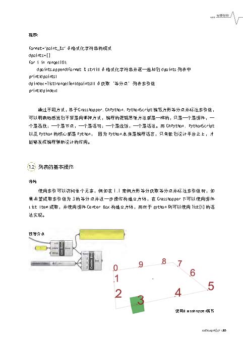 《學(xué)習PYTHON—做個有編程能力的設(shè)計師》不是純粹的Python編程學(xué)習,而是在學(xué)習基本Python編程語言時闡述輔助設(shè)計的方法,從Python Shell到RH_Python再到GH_Python,將Python真正作為設(shè)計者從事設(shè)計輔助的編程語言;同時這又不是純粹幾何形式編程的說明,而是包括Python編程數(shù)據(jù)結(jié)構(gòu)、基本語句、函數(shù)與類的學(xué)習過程。