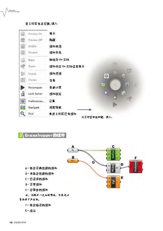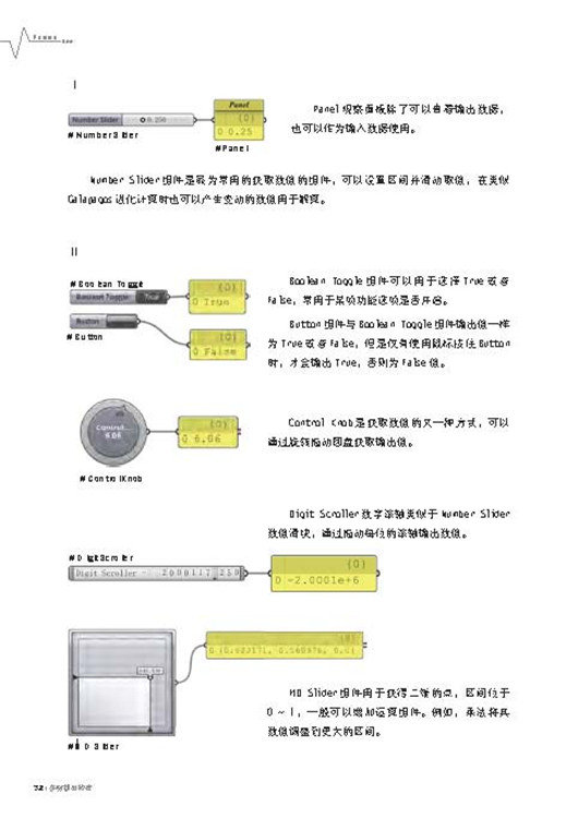 《參數(shù)模型構(gòu)建》主要是按照Grasshopper中組件的分組組織本書講解的架構(gòu)。包括“基礎(chǔ)”部分,講述Grasshopper和Add-ons的安裝,并通過一個小案例說明使用Grasshopper節(jié)點可視化編程的基本操作流程;