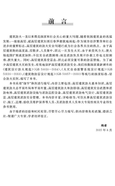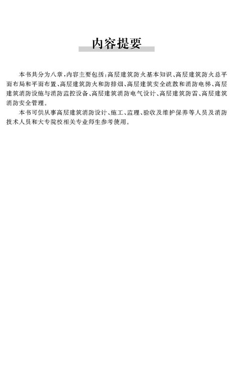 本書(shū)可供從事高層建筑消防設(shè)計(jì)、施工、監(jiān)理、驗(yàn)收及維護(hù)保養(yǎng)等人員及消防技術(shù)人員和大專院校相關(guān)專業(yè)師生參考使用。