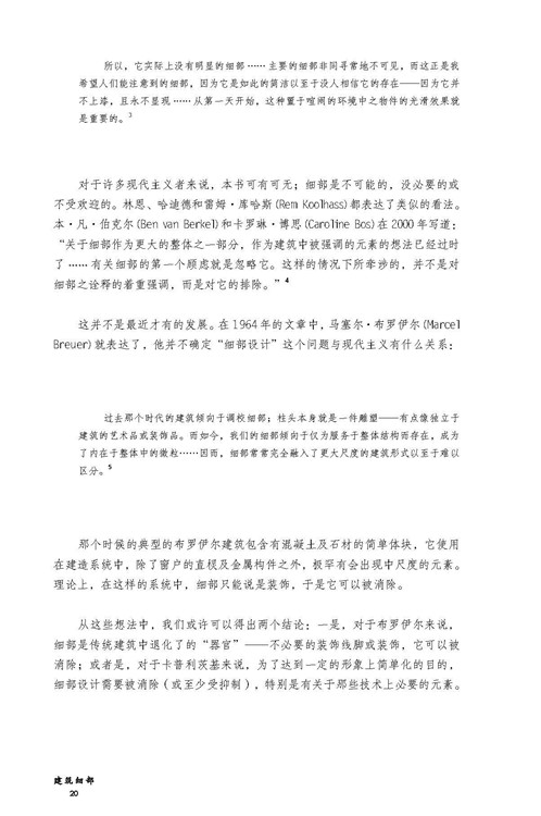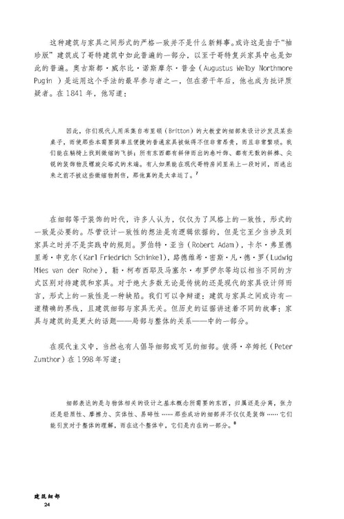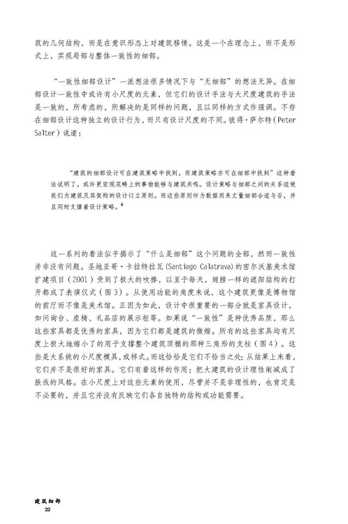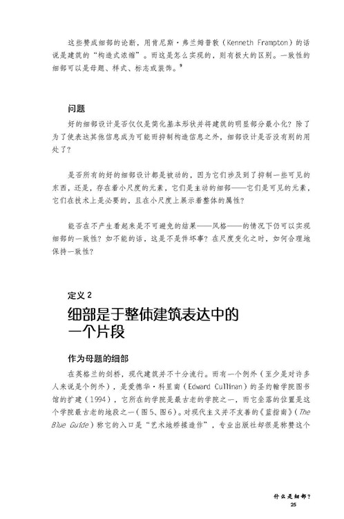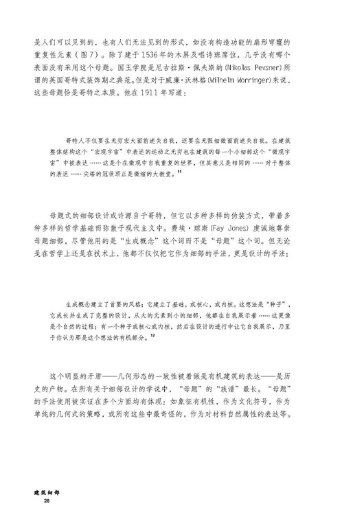 細(xì)部是理解一座建筑的基礎(chǔ),而非附屬品。這并不是說細(xì)部包含著整座建筑的概念;這本書其實(shí)是要論證與之相反的觀點(diǎn),對整座建筑的理解不能脫離對細(xì)部的理解,而且細(xì)部的角色并不僅僅是要創(chuàng)造自然的影射與聯(lián)系。深刻的細(xì)部遠(yuǎn)遠(yuǎn)超出構(gòu)造本身,但是它們源自于構(gòu)造。建筑,在我看來,是建造的藝術(shù),如果它要傳達(dá)出某種深刻的意義,就會通過構(gòu)造來表達(dá)。構(gòu)造并非僅僅意味著建造,也不僅僅是對實(shí)際需求的滿足,而是通過我們的詮釋、我們的理解被視作為科技的展現(xiàn),被視為會引起我們的直覺反應(yīng)的事物,也被視為我們所知的歷史的一部分。我堅(jiān)信建筑會表達(dá)出很多信息,但無法僅僅通過影射來做到這一點(diǎn),或者說無法僅僅通過影射就能實(shí)現(xiàn)很好的表達(dá)。