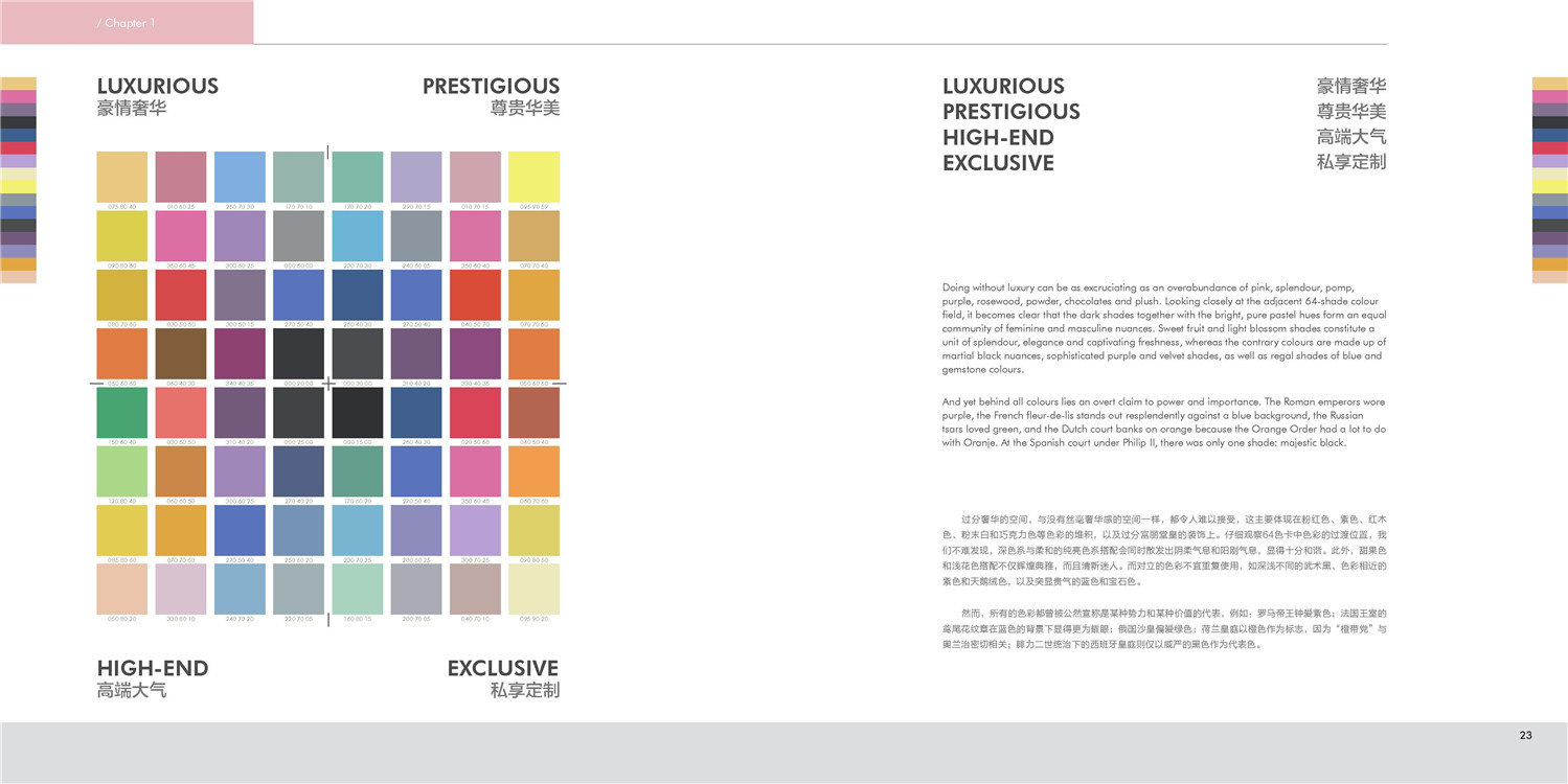 《酒店色彩教程》既可稱(chēng)作設(shè)計(jì)研究的學(xué)術(shù)論文,又可充當(dāng)創(chuàng)意手冊(cè)和空間設(shè)計(jì)指南。書(shū)中不僅分析了大量實(shí)例,而且提供了試驗(yàn)性的設(shè)計(jì)范本。依據(jù)對(duì)現(xiàn)有酒店色彩搭配以及其他相關(guān)設(shè)計(jì)領(lǐng)域的學(xué)術(shù)研究,書(shū)中用大量的篇幅作了色彩分析。還從色彩、外觀和內(nèi)容等角度分析了116個(gè)形容酒店的短語(yǔ)。本書(shū)與其說(shuō)是一份研究報(bào)告,不如說(shuō)是一套色彩搭配教程,因?yàn)闀?shū)中每一頁(yè)都為設(shè)計(jì)提供了配色方案。閱讀此書(shū)能啟發(fā)靈感,升華設(shè)計(jì),更能化繁為簡(jiǎn),完善設(shè)計(jì)。本書(shū)以舒適、美觀的酒店空間為案例,從五星級(jí)酒店到設(shè)施齊全的鄉(xiāng)村酒店,從專(zhuān)為富翁打造的奢華七星級(jí)酒店到樸素的山間農(nóng)舍,抑或是風(fēng)格別致的家庭式小鎮(zhèn)酒店,書(shū)中應(yīng)有盡有。人們?yōu)楹胃缸」诺滹L(fēng)格的酒店,而不愿住設(shè)計(jì)感強(qiáng)的酒店?書(shū)中的案例將給予我們答案。酒店之間的競(jìng)爭(zhēng)力為何存在差異?這也是本書(shū)試圖解答的問(wèn)題。酒店的選擇并不完全取決于價(jià)格的高低;熱情的態(tài)度并不意味著客房的溫度適宜;出色的廚師并不能保證餐廳內(nèi)的座椅舒適;亮堂整潔的客房也不等同于友善的服務(wù)。書(shū)中總結(jié)了各種空間的特點(diǎn),告訴你哪些酒店會(huì)令你印象深刻,哪些酒店會(huì)給你噩夢(mèng)般的感覺(jué)。書(shū)中酒店的色彩是依據(jù)RAL色系編碼,色彩的深淺可以通過(guò)基于純天然植物顏料的印染技術(shù)進(jìn)行調(diào)整,尤其是在天然纖維的情況下。