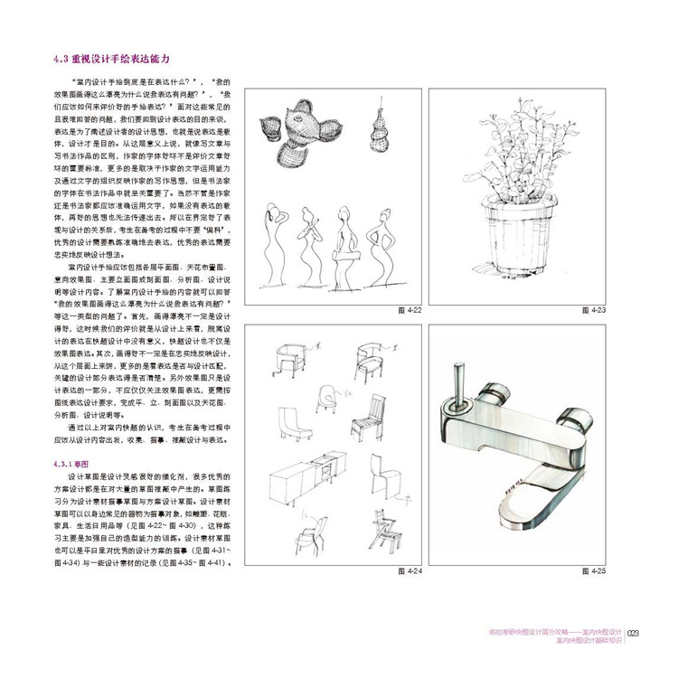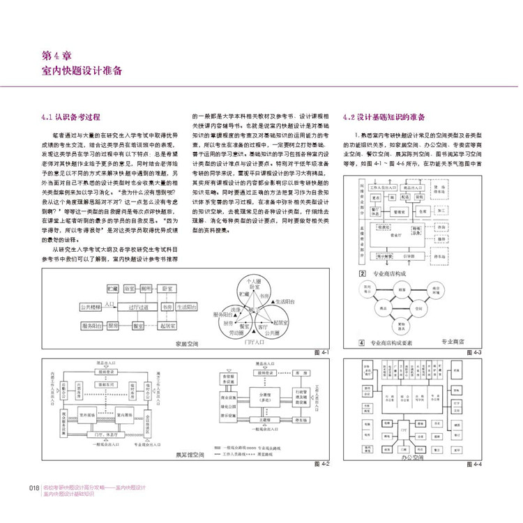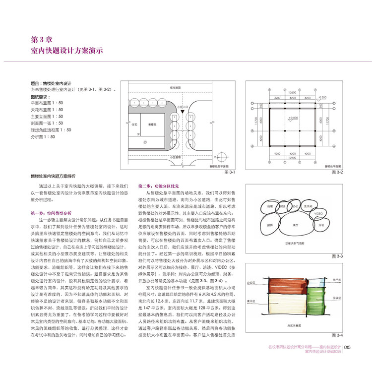 本書不是純粹的設計方法論介紹,而是重點介紹了室內(nèi)快題設計的做題思維步驟、設計準備并對優(yōu)秀案例進行了分析。本書包括室內(nèi)快題設計基礎知識及知名院校研究生入學考試室內(nèi)設計快題設計案例淺析與點評兩部分內(nèi)容。第一部分包括四章:第1章主要從室內(nèi)快題設計定義來闡述快題設計對設計師以及本專業(yè)高、低年級學生的重要性,從研究生入學考試室內(nèi)快題的相關常識及評價標準來分析設計的重點;第2章重點介紹了室內(nèi)快題的思維步驟;第3章闡述了室內(nèi)快題思維步驟的具體運用;第4章從認識備考過程、調整復習心態(tài)、加強室內(nèi)基礎知識學習與重視設計手繪表達、了解快題設計常用工具及其屬性、學習快題設計中常用基本規(guī)范等方面來闡述如何準備室內(nèi)快題設計。第二部分選擇了部分知名設計院校研究生入學試卷(含初試、復試和保送考試試題)及海上藝號室內(nèi)快題培訓試題共16套題目做了淺析,并對優(yōu)秀試卷做了點評。雖然設計本身沒有唯一的標準答案,但我們應該從題目給予的條件來解讀其中的“考點”,針對同一題目本書挑選了幾個不同的案例,從而供讀者橫向比較,幫助讀者從每個案例中找到一些值得借鑒的地方,使其得到一定的啟發(fā),這就是本書的意義所在。
