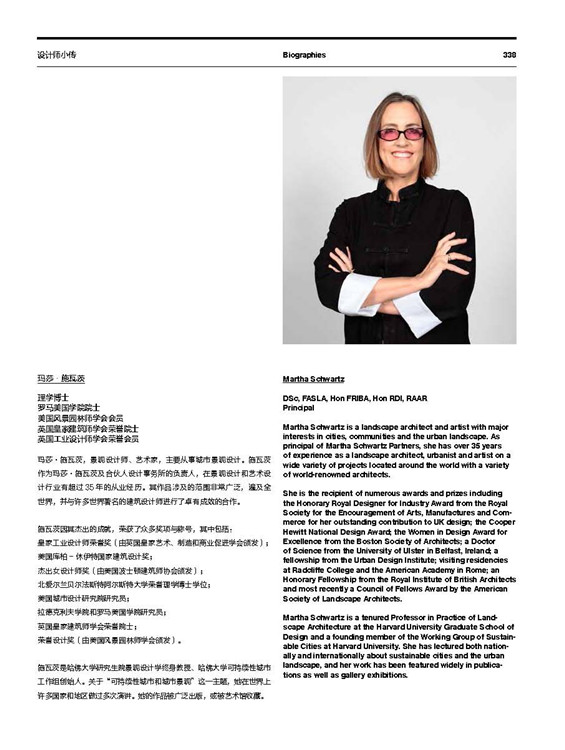 本書(shū)主要展示了美國(guó)景觀設(shè)計(jì)大師瑪莎·施瓦茨從業(yè)以來(lái),在世界各地極具影響力的代表作品,是一部集大成的景觀綜合藝術(shù)寶典,其作品注重都市場(chǎng)所和城市中心的激活和再生。作為國(guó)際知名設(shè)計(jì)大師,瑪莎·施瓦茨和她的團(tuán)隊(duì)已擁有30 多年的設(shè)計(jì)經(jīng)驗(yàn),運(yùn)用景觀、藝術(shù)和都市理念,打造眾多小品裝置、花園、公共廣場(chǎng)、公園、機(jī)構(gòu)景觀、公司總部、總體規(guī)劃和城市再生景觀。其作品涉及城市生活的方方面面,注重營(yíng)造可持續(xù)發(fā)展的城市景觀和公共空間,為城市生活提供了良好的平臺(tái)。