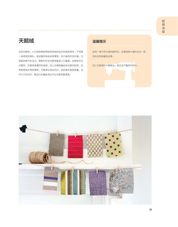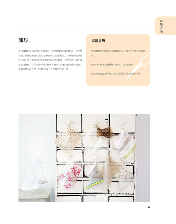 第三章主要介紹令窗簾獨(dú)具特色的小點(diǎn)綴,如飾邊、拉繩、流蘇、扣件和掛布鉤。它們種類繁多,色彩豐富。除此之外,內(nèi)容還涉及窗簾圖案的選擇,以及使用飾邊和其他點(diǎn)綴使窗簾獨(dú)樹一幟的絕妙想法。
