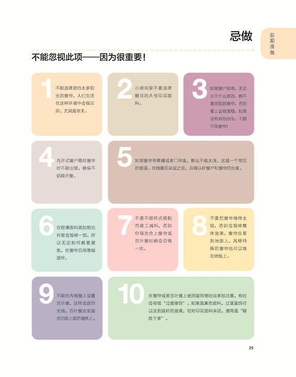 最后,第十章主要介紹制作窗簾和百葉窗所需的基本技能和技術(shù),力求幫助讀者獨(dú)立完成多數(shù)設(shè)計(jì)。在確定窗飾設(shè)計(jì)方案之后,便可以使用顏色為布料進(jìn)行設(shè)計(jì)涂色,這其中可以混合并搭配不同的元素。本書為讀者提供了多個(gè)可選方案,希望讀者在窗飾創(chuàng)意設(shè)計(jì)的過程中靈活地加以選擇。
