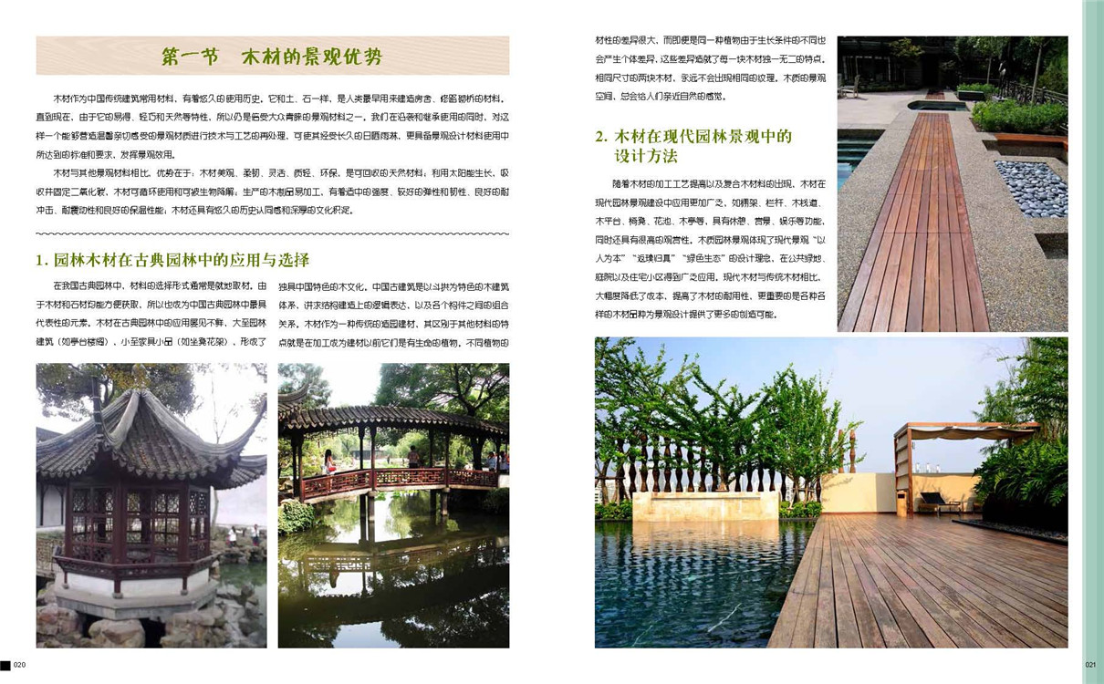 目前,木材應(yīng)用于景觀設(shè)計(jì)正處在一個新舊材料、新舊技術(shù)交替時期,不久的將來,在充分保護(hù)環(huán)境和遵守有關(guān)國家規(guī)定的前提下,從生態(tài)、資源可持續(xù)發(fā)展的角度積極、合理地開發(fā)利用木材資源,相信專用室外才材及其景觀制品將得到更廣泛的應(yīng)用及大家的認(rèn)可。本書的亮點(diǎn)在于: