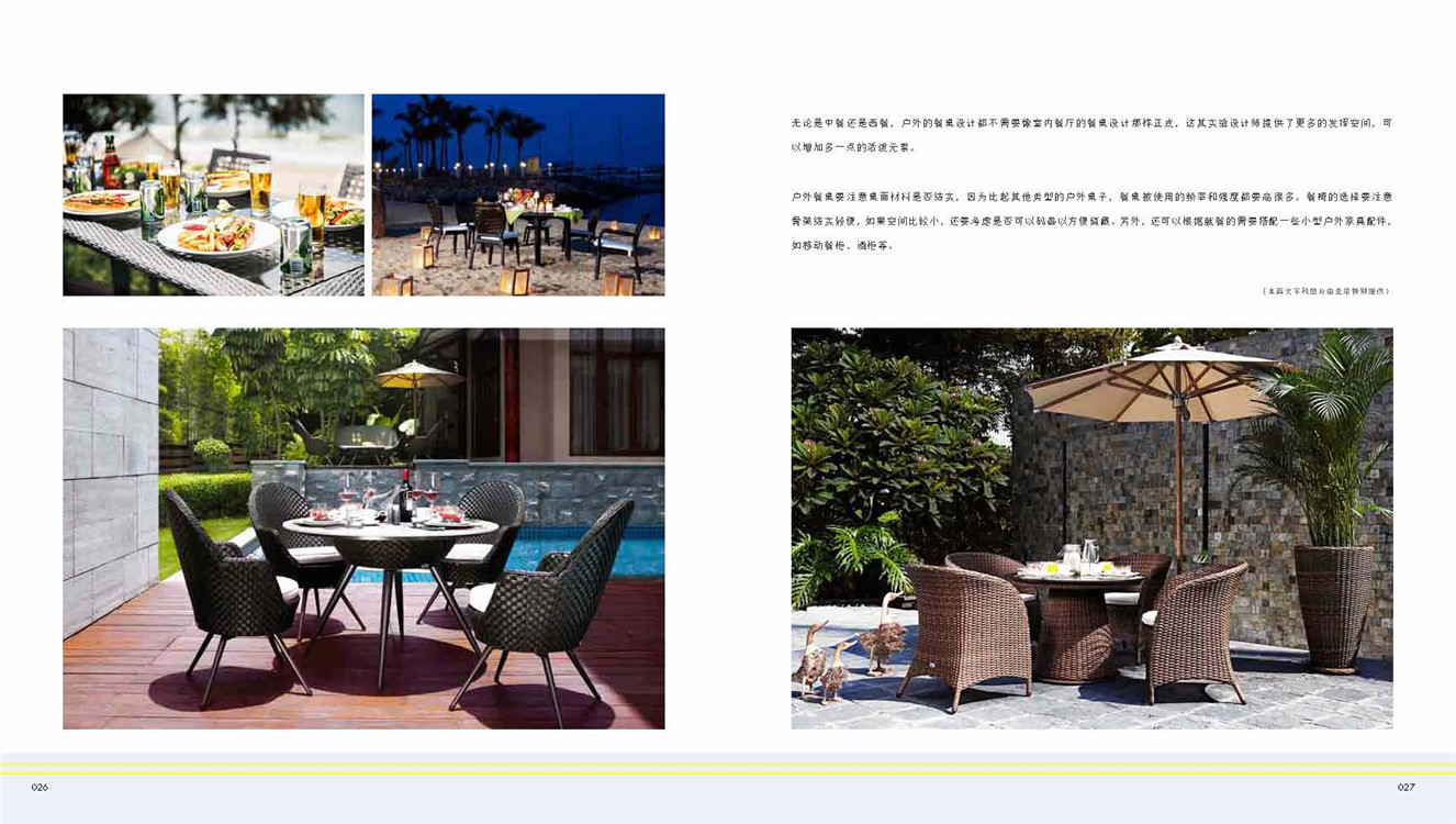 目前室外軟裝設(shè)計(jì)主要也是模仿歐美。隨著軟裝設(shè)計(jì)概念的興盛,使室外家具的搭配融入燈光、花藝、布藝等軟裝元素,更注重整體性和豐富性?!稇敉廛浹b》一書通過介紹室外家具的歷史、材料、養(yǎng)護(hù)知識等,以及大量來自歐美出色的室外家具搭配案例,為設(shè)計(jì)師的戶外整體設(shè)計(jì)提供有效的解決方案。
