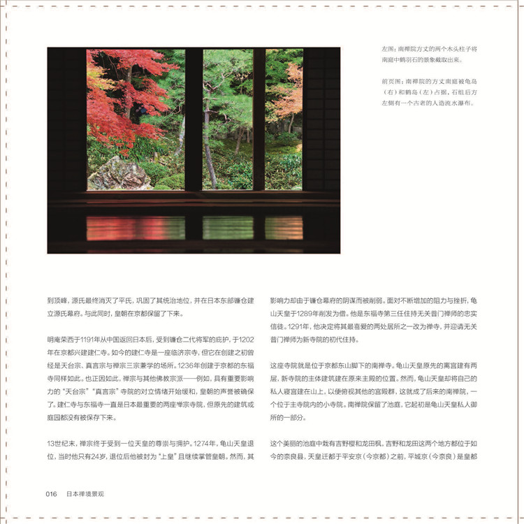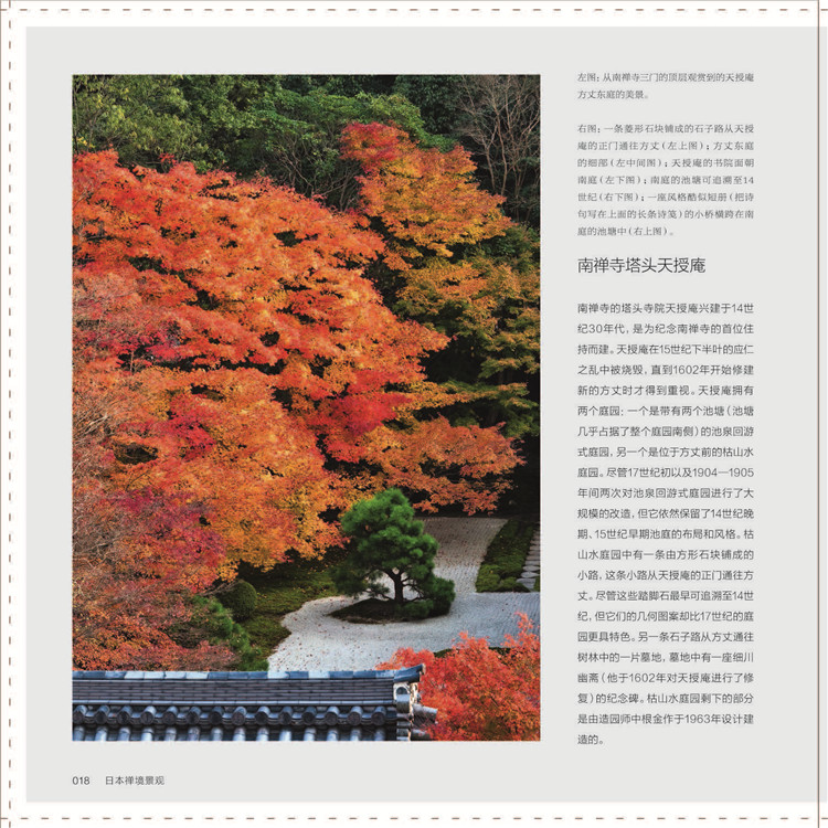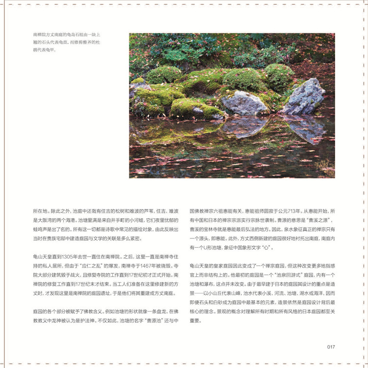 本書配合英國花園攝影師Alex Ramsay的精美圖片,介紹了日本禪宗庭園的發(fā)展歷史。作者試圖通過追尋這段歷史,來展現(xiàn)不同文化跨越時空的融合,包括古代與現(xiàn)代,本土與外來。內(nèi)容上主要講述了如何催生出多元化的日本庭園設(shè)計傳統(tǒng),并且如何將其影響力擴展到佛教寺院的范圍之外,以及禪宗庭園中的景觀設(shè)計手法。此外,另有一章專門探討禪境景觀與日本茶庭的關(guān)系,并介紹庭園中具有重要價值的樹木與灌木等細節(jié)設(shè)計。