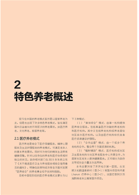 現(xiàn)今在中國的養(yǎng)老模式雖然是以居家養(yǎng)老為主,但是也出現(xiàn)了許多特色養(yǎng)老模式,旨在滿足國內(nèi)日益增長的不同層次的養(yǎng)老需求,如醫(yī)療養(yǎng)老、文化養(yǎng)老、旅居養(yǎng)老等。