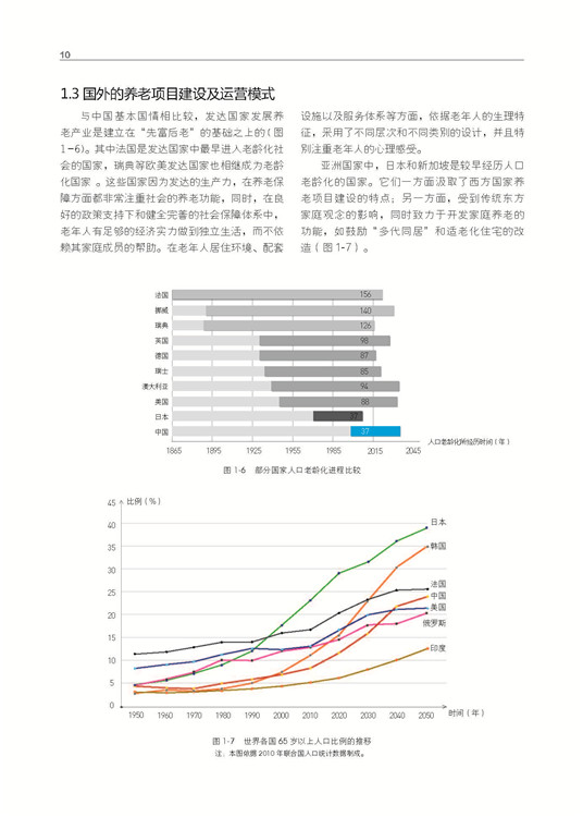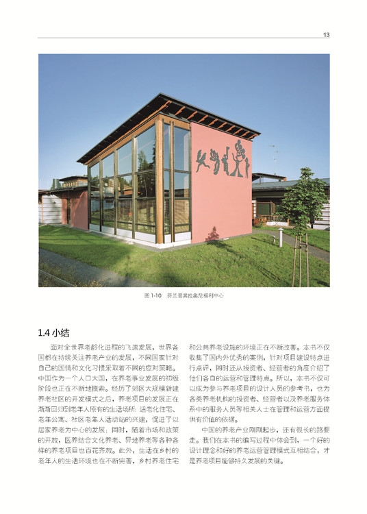 面對全世界老齡化進程的飛速發(fā)展,世界各國都在持續(xù)關(guān)注養(yǎng)老產(chǎn)業(yè)的發(fā)展,不同國家針對自己的國情和文化習(xí)慣采取著不同的應(yīng)對策略。中國作為一個人口大國,在養(yǎng)老事業(yè)發(fā)展的初級階段也正在不斷地摸索。經(jīng)歷了郊區(qū)大規(guī)模新建養(yǎng)老社區(qū)的開發(fā)模式之后,養(yǎng)老項目的發(fā)展正在漸漸回歸到老年人原有的生活場所:適老化住宅、老年公寓、社區(qū)老年人活動站的興建,促進了以居家養(yǎng)老為中心的發(fā)展。隨著現(xiàn)階段養(yǎng)老需求的急劇上升和社會對養(yǎng)老認識的逐步提高,人們選擇的養(yǎng)老地點逐漸回歸到老年人原有的居住區(qū)附近。養(yǎng)老方式以縮短老年人的養(yǎng)老生活與原有生活之間的差距為首選。所以,本書不僅可以成為參與養(yǎng)老項目的設(shè)計人員的參考書,也為各類養(yǎng)老機構(gòu)的投資者、經(jīng)營者以及養(yǎng)老服務(wù)體系中的服務(wù)人員等相關(guān)人士在管理和運營方面提供有價值的依據(jù)。