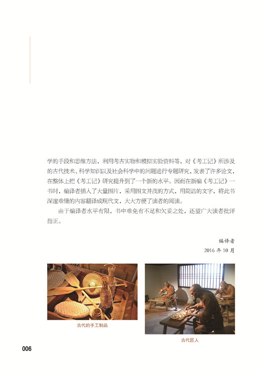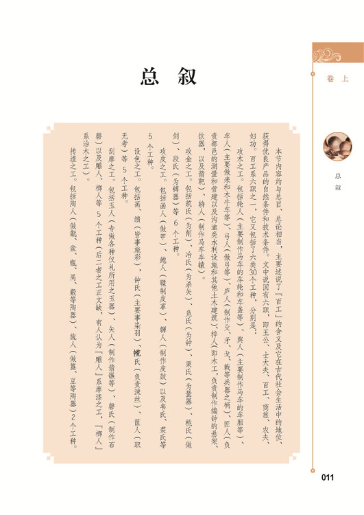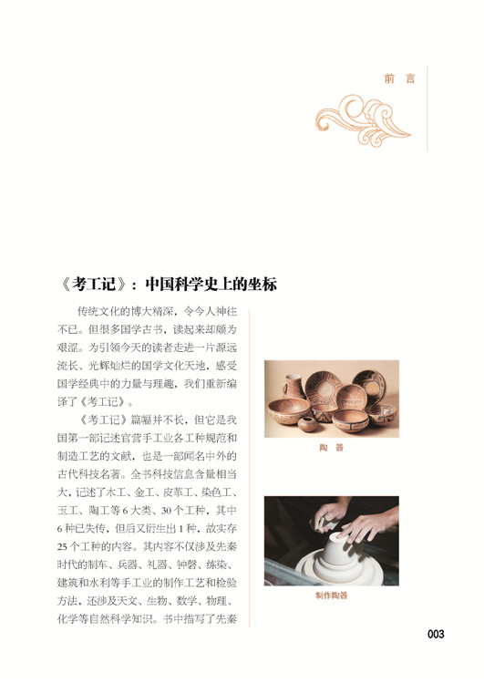 《考工記》是我國第一部記述官營手工業(yè)各工種規(guī)范和制造工藝的文獻(xiàn),全書記述了木工、金工、皮革工、染色工、玉工、陶工等6大類,30個(gè)工種。內(nèi)容不僅涉及先秦時(shí)代的制車、兵器、禮器、練染、建筑和水利等手工業(yè)的制作工藝和檢驗(yàn)方法,還涉及天文、生物、數(shù)學(xué)、物理、化學(xué)等自然科學(xué)知識,記載了一系列的生產(chǎn)管理和營建制度。本書采用原典、注釋、譯文對應(yīng)的方式對考工記進(jìn)行了新解,并加入了現(xiàn)代的相關(guān)知識和技術(shù)供讀者鑒賞。
