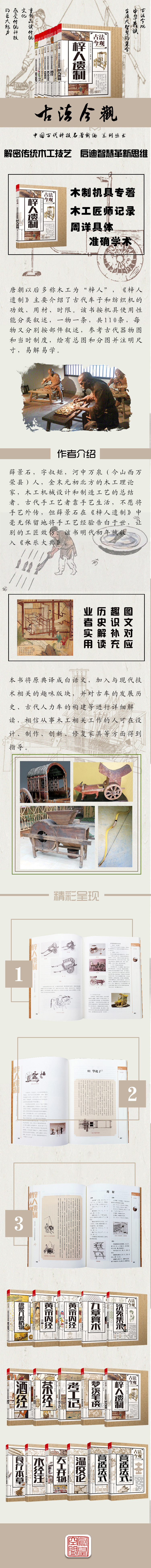 《梓人遺制》本書按機具使用性能分類敘述,每類先介紹歷史,一物一條,共一百一十條。每物又分別按其部件敘述,參考古代器物圖和當時制度,繪有總圖和分圖并注明尺寸,易解易學,比較實用。本書作者除對古文原典進行注解、翻譯外,還加入與現(xiàn)代技術相關聯(lián)的知識性、趣味性版塊,使讀者一覽古代科技對當代科技進步的影響。