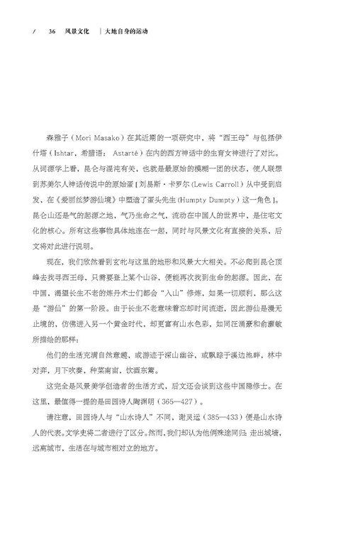 本書所表達(dá)的景觀是一個(gè)文化的、主觀的對(duì)象,并不簡(jiǎn)單等同于某一物理環(huán)境空間,它存在于凝視著它的民眾的視線下。本書內(nèi)容上主要包括六個(gè)部分,分別為歷史的浪潮、大地自身的運(yùn)動(dòng)、三月三、事眛竟誰辨、質(zhì)有而趣靈、說破之前的隱晦。著者從詞源學(xué)、文學(xué)、藝術(shù)史以及人種學(xué)等多學(xué)科的角度,嘗試闡釋“思索景觀”與“享樂景觀”這兩個(gè)現(xiàn)象之間的主要矛盾,同時(shí)用比較的方法帶我們?yōu)g覽了眾多大陸的歷史,引發(fā)讀者對(duì)“景觀”概念尤其是文化景觀更深層的思考。