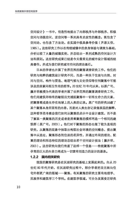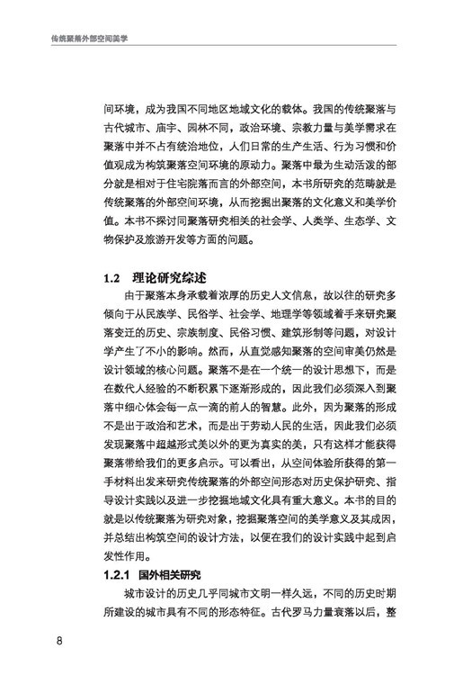 本書對傳統(tǒng)聚落的審美體系進行總結(jié),以喚醒彌留在人們心底的審美意識;同時系統(tǒng)的提出聚落外部空間設(shè)計方法,一方面可以在聚落設(shè)計實踐中起到一定的啟發(fā)作用,另一方面在于以傳統(tǒng)聚落研究為載體,并通過時代的手段再現(xiàn)給人們空間美學(xué)的魅力。
