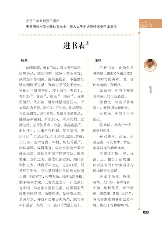 《飲膳正要》一書為元朝·飲膳太醫(yī)忽思慧所撰的一部營養(yǎng)學(xué)專著,全書共三卷:卷一講的是諸般禁忌,聚珍品撰;卷二講的是諸般湯煎,食療諸病及食物相反中毒等;卷三講的是米谷品,獸品、禽品、魚品、果菜品和料物等。該書記載藥膳方和食療方非常豐富,特別注重闡述各種飲撰的性味與滋補(bǔ)作用,并有妊娠食忌、乳母食忌、飲酒避忌等內(nèi)容。它從健康人的實(shí)際飲食需要出發(fā),以正常人膳食標(biāo)準(zhǔn)立論,制定了一套飲食衛(wèi)生法則。書中還具體闡發(fā)了飲食衛(wèi)生,營養(yǎng)療法,乃至食物中毒的防治等。為我國現(xiàn)存一部完整的飲食衛(wèi)生和食療專書,也是一部頗有價值的古代食譜。