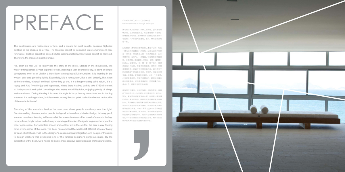 《都市桃源——空中豪宅》主要以世界各大城市市區(qū)高層高級(jí)住宅區(qū)得樣板豪宅為主,現(xiàn)在全球包括中國(guó)在內(nèi)的許多城市土地都非常稀少在市區(qū)的住宅主要傾向于高層住宅,現(xiàn)代城市人的生活水平在不斷提高,許多成功人士對(duì)生活品味極致追求,懸在半空中豪華舒適居所,讓人煥發(fā)了兒時(shí)般得夢(mèng)幻即“夢(mèng)幻天堂”的生活方式,同時(shí)一種居高臨下仰望美景不但顯示主人的成功也是至高的生活享受。所以高層中的超級(jí)豪宅應(yīng)韻而生,本書主要講敘就是一些知名城市的高層中的豪宅項(xiàng)目,像紐約,舊金山,倫敦,巴黎,首爾,新加坡,馬尼拉,香港,臺(tái)灣,上海,東京等各大城市的一些高層豪宅案例,本書將能給設(shè)計(jì)師提供許多低層或高層豪宅項(xiàng)目學(xué)習(xí)參考的靈感。