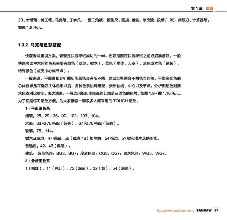 本書從易到難、由淺入深,共分為三大部分、八個章節(jié)。第一部分為“緒論”,主要講解快題設(shè)計(jì)的相關(guān)知識,形成快題設(shè)計(jì)的基本輪廓框架。第二部分包括第2~7 章,這是本書的核心部分,其中第3 章“建筑知識”、第4 章“城市道路交通知識”、第7 章“空間結(jié)構(gòu)類型與空間組合”更是本書的重中之重。第三部分為第8章,主要講解一個完整的城市規(guī)劃快題設(shè)計(jì)的創(chuàng)作過程。