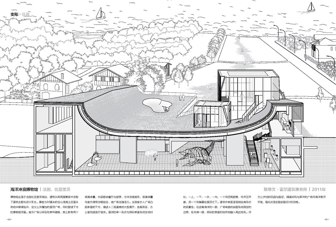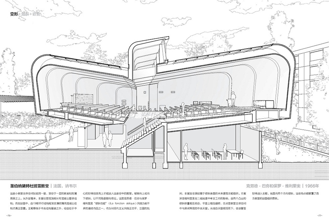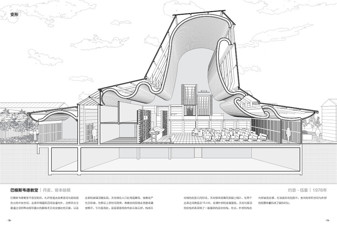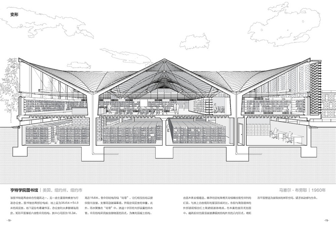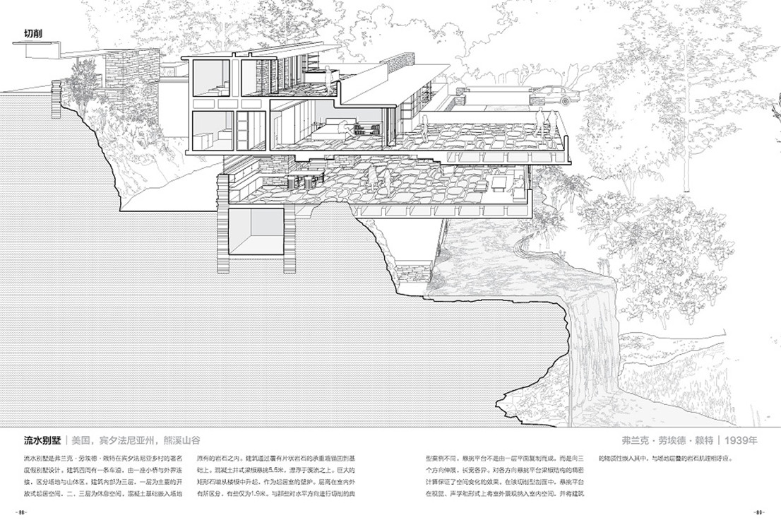 本書共總結(jié)出7個(gè)類別的剖面圖,展示了簡(jiǎn)單的單層建筑和具有復(fù)雜結(jié)構(gòu)特征的堆疊建筑,以各種方法進(jìn)行剖面展示與解析。為了說明這些類別,在經(jīng)過對(duì)眾多文獻(xiàn)的研究后,作者們構(gòu)造出63個(gè)知名建筑項(xiàng)目精致詳細(xì)的剖面透視圖(包含國(guó)際上近百年的知名的建筑結(jié)構(gòu))。這本書也包含了一些巧妙且易理解的有關(guān)歷史和剖面應(yīng)用的注解。