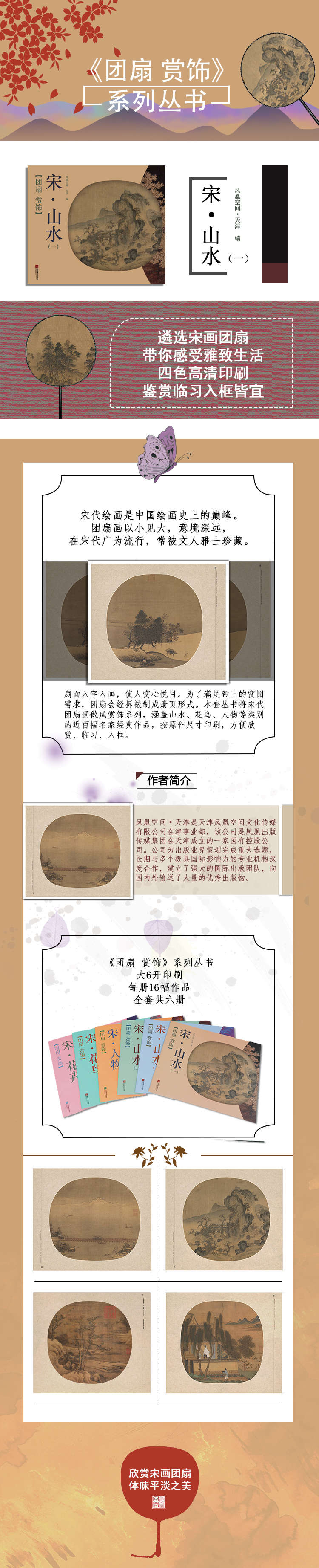 中國(guó)宋朝延續(xù)三百多年,民間繪畫、宮廷繪畫、士大夫繪畫各自形成體系,彼此間又相互影響、吸收、滲透,構(gòu)成宋代繪畫豐富多彩的面貌。本系類叢書將宋代團(tuán)扇畫做成賞飾系列,涵蓋山水、花鳥、人物等各類別,包括上百幅經(jīng)典作品,原作尺寸、高清印刷,供廣大讀者及愛好者欣賞、臨習(xí),亦可直接入框做裝飾用。如宋朝文人一樣,心中有山水,有一片屬于自己的山水。