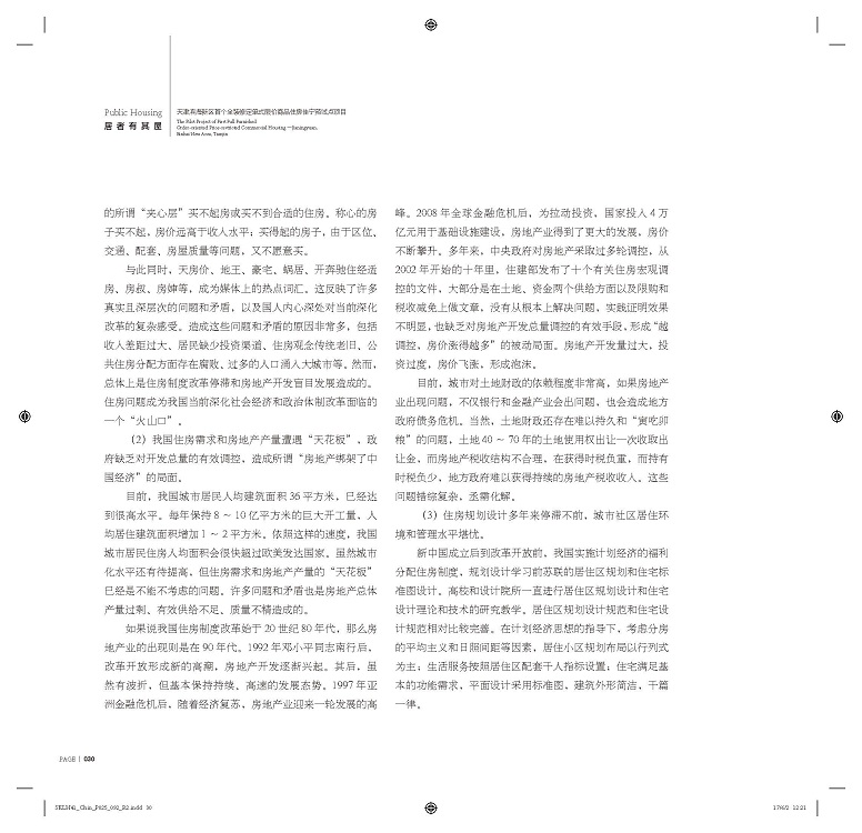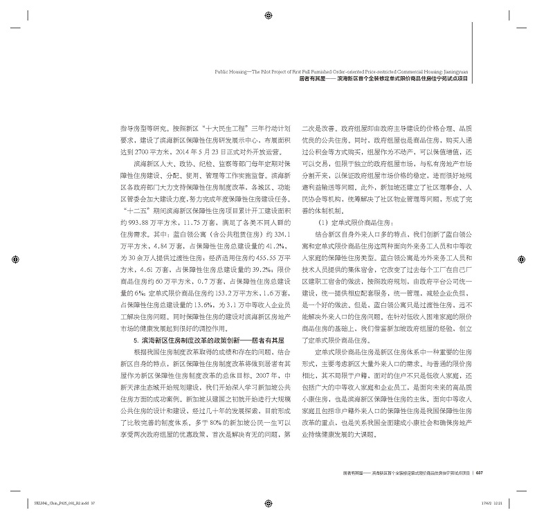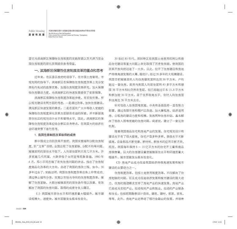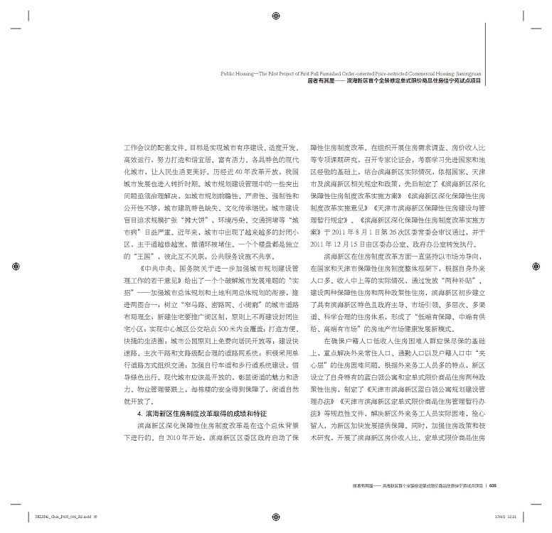 2006年,濱海新區(qū)的開發(fā)開放被納入國(guó)家發(fā)展戰(zhàn)略,同時(shí)被確定為綜合配套改革試驗(yàn)區(qū)。作為中國(guó)經(jīng)濟(jì)增長(zhǎng)的第三極,濱海新區(qū)以改革創(chuàng)新為引領(lǐng),推動(dòng)了包括保障性住房制度改革在內(nèi)的“十大改革”,嘗試在一些關(guān)鍵環(huán)節(jié)先行先試。濱海新區(qū)保障性住房制度改革,堅(jiān)持以市場(chǎng)化為導(dǎo)向,在國(guó)家和天津市相關(guān)政策的基礎(chǔ)上,結(jié)合新區(qū)外來人口多、技術(shù)工人多的特點(diǎn),創(chuàng)立了定單式限價(jià)商品住房這一新的保障性住房類型,將保障性住房由傳統(tǒng)的面向戶籍低收入住房困難家庭擴(kuò)大到面向中等收入家庭(包括非戶籍外來人口),初步形成了“低端有保障、中端有供給、高端有市場(chǎng)”的保障性住房制度新模式。2010年,新區(qū)第一個(gè)定單式限價(jià)商品住房項(xiàng)目欣嘉園動(dòng)工,對(duì)新區(qū)招商引資、吸引人才落戶發(fā)揮了很好的作用。與此同時(shí),我們開展了房?jī)r(jià)收入比、定單式限價(jià)商品住房指導(dǎo)房型等課題研究,在相關(guān)配套政策和規(guī)劃設(shè)計(jì)上下功夫,努力讓定單式限價(jià)商品住房做到房屋質(zhì)量良好、居住環(huán)境優(yōu)美、配套設(shè)施完善、價(jià)格合理、供給充足,成為新區(qū)保障型住房的主力。