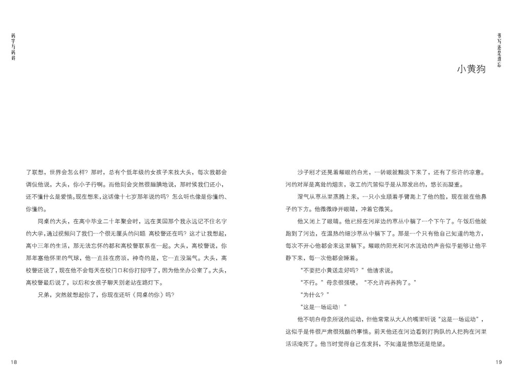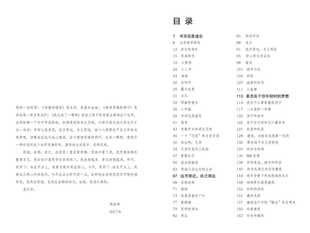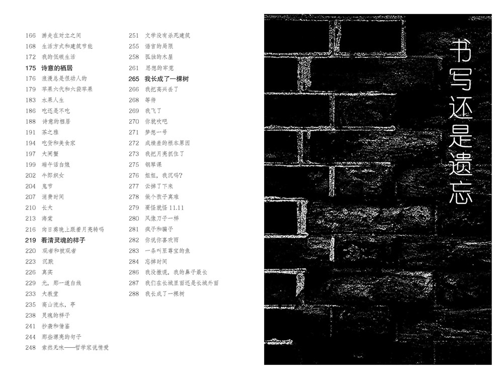 本書共分為六部分:《書寫還是遺忘》是有關(guān)時(shí)間、記憶的;《遠(yuǎn)方很近,自己很遠(yuǎn)》講述的是空間地理;《要忠于自己年輕時(shí)的夢(mèng)想》是作者多年來對(duì)建筑的一些思考;《詩(shī)意的棲居》是生活、柴米油鹽;《看清靈魂的樣子》更多的是一種自我治療;《我長(zhǎng)成了一棵樹》則以詩(shī)歌的形式,嘗試從孩子的角度去看待這個(gè)世界。