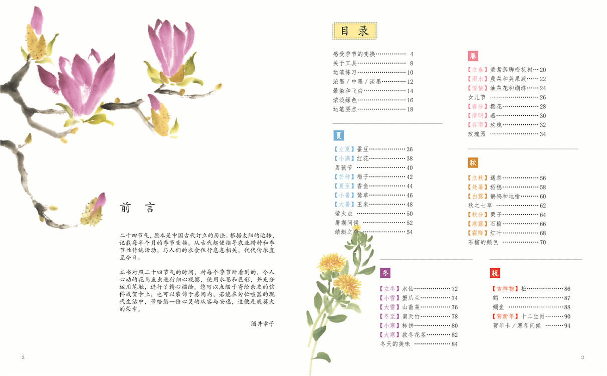 本書對照二十四節(jié)氣的時間,對每個季節(jié)所看到的,令人心動的花鳥魚蟲進行細心觀察,使用水墨和色彩,并充分運用筆觸,進行了精心描繪。您可以點綴于寄給親友的信件或賀卡上,也可以用于裝飾房間,若能在匆忙喧囂的現(xiàn)代生活中,帶給您一分心靈的從容與安逸,這便是我莫大的榮幸。