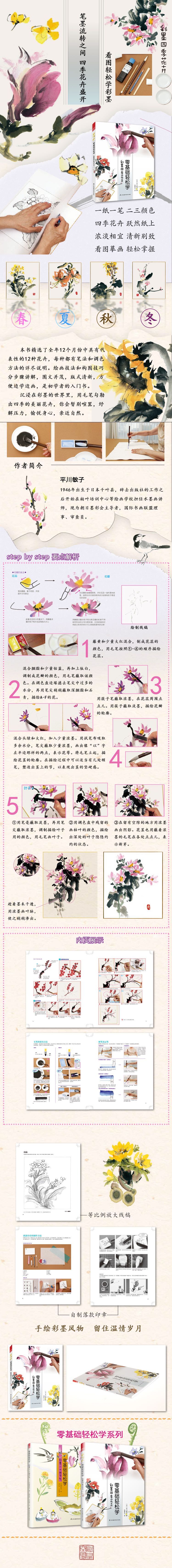 本書是一本適合水墨畫初學(xué)者的繪畫入門書,本書精選了全年12個月份中具有代表性的12種花卉。本書共分為三個部分。第一部分展示了12種花卉完成之后的作品;第二部分講解了水墨畫的技巧和使用工具;第三部分對12種花卉的繪畫技法和構(gòu)圖技巧進(jìn)行分步驟講解。