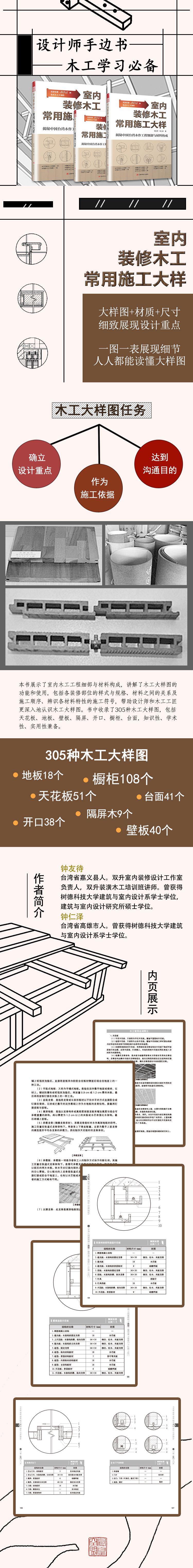 本書完整收錄了305種各式木工大樣圖,其中天花板木工大樣圖51個、地板木工大樣圖18個、壁板木工大樣圖40個、隔屏木工大樣圖9個、開口木工大樣圖38個、櫥柜木工大樣圖108個和臺面木工大樣圖41個。本書詳細(xì)地講述了木工大樣圖應(yīng)該具備的功能和使用需求,同時也從確立設(shè)計重點(diǎn)、作為施工依據(jù)、達(dá)到溝通目的三個方面,講解了各裝修部位的樣式與規(guī)格、材料之間的關(guān)系及施工順序及辨識各材料特性的施工符號,讓設(shè)計師和木工工匠能夠?qū)δ竟ご髽訄D有更加深入和清晰的認(rèn)知。本書兼?zhèn)渲R性、學(xué)術(shù)性和實(shí)用性,適合設(shè)計師及木工工匠進(jìn)行學(xué)習(xí)與參考,是國內(nèi)第一本專業(yè)木工施工大樣圖集,也是一本無可替代的木工設(shè)計權(quán)威用書。