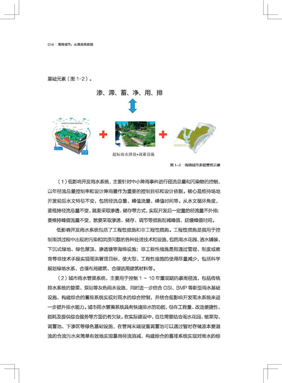 第二部分為規(guī)劃,針對海綿城市的規(guī)劃編制總體概況以及相關(guān)規(guī)劃要點(diǎn)進(jìn)行了詳細(xì)的分析,從海綿空間格局、低影響開發(fā)雨水系統(tǒng)構(gòu)建、專項規(guī)劃銜接、總體建設(shè)任務(wù)、近期建設(shè)詳細(xì)規(guī)劃和指導(dǎo)手冊等多個層面,結(jié)合相關(guān)規(guī)劃實例做了系統(tǒng)的解讀。