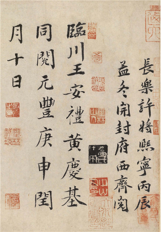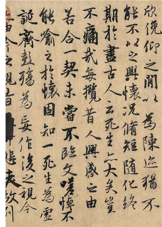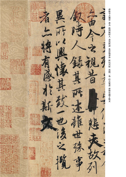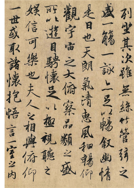 《蘭亭序》通篇如行云流水,渾然天成。用筆精嚴細膩、方圓兼?zhèn)?,行筆果斷穩(wěn)健,下筆干凈利落、道勁自然。結(jié)體欹側(cè)多變、疏密相間,注重字的姿態(tài)變化,全篇21個“之”字均以不同形態(tài)呈現(xiàn),其他重字同樣構(gòu)形巧妙。章法布局疏密自然,字體大小參差、錯落有致,各字間距隨手所如。通篇氣脈貫通、形神兼具,于自然暢達中盡顯作者的超逸和儒雅。