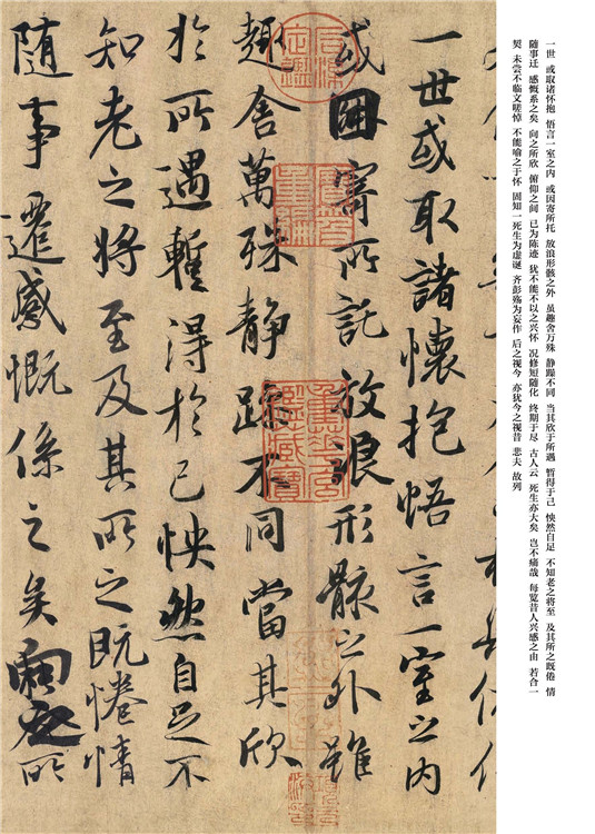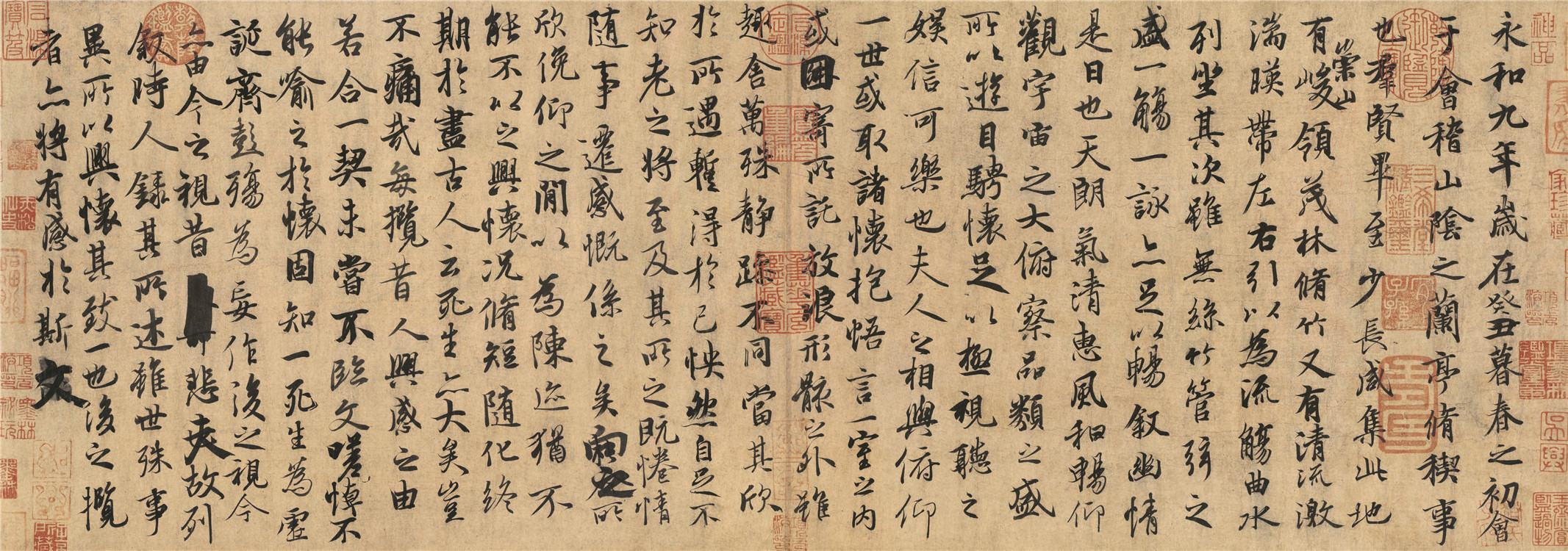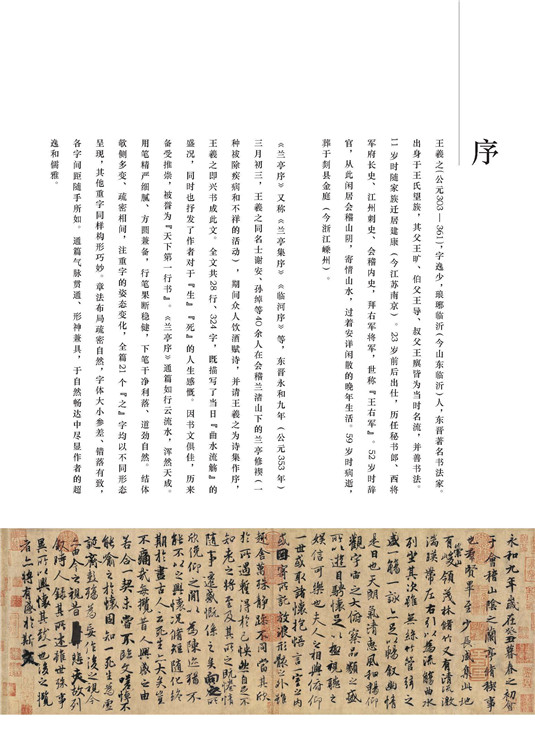 《蘭亭序》又稱《蘭亭集序》《臨河序》等,東晉永和九年(公元353年)三月初三, 王羲之同名士謝安、孫綽等40余人在會稽蘭渚山下的蘭亭修褉(一種祓除疾病和不祥的活動),期間眾人飲酒賦詩,并請王羲之為詩集作序,王羲之即興書成此文。全文共28行、324字,既描寫了當日“曲水流觴”的盛況,同時也抒發(fā)了者對于“生”“死”的人生感慨。因書文俱佳,歷來備受推崇。