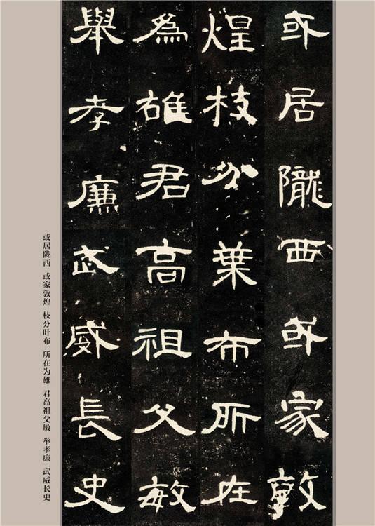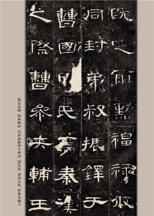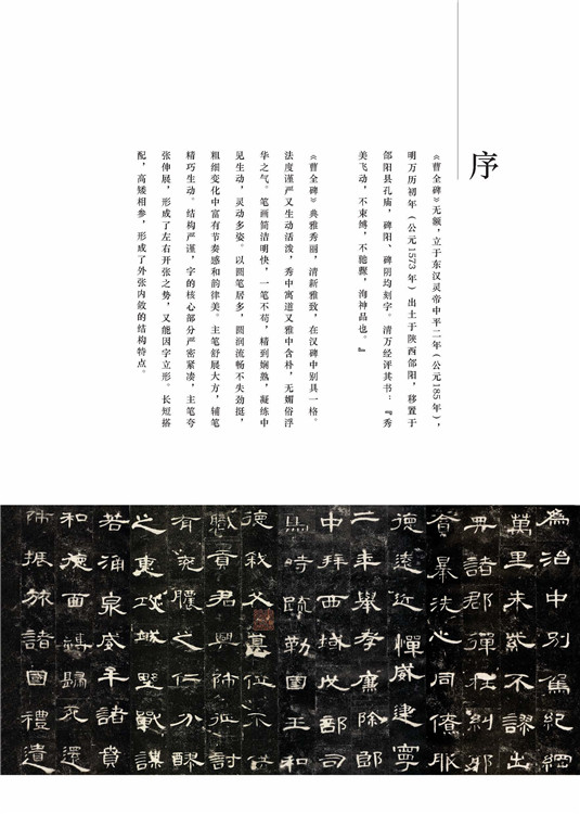 《曹全碑》屬典雅秀麗一路,格調(diào)清新雅致,在漢碑中別具一格,法度謹(jǐn)嚴(yán)又能生動(dòng)活潑,精美道逸,秀而不俗,巧不傷雅;雅中含樸,秀中寓道,無(wú)媚俗浮華之氣?!恫苋返墓P畫簡(jiǎn)潔明快,一筆不茍,精到嫻熟,凝練中見(jiàn)生動(dòng),靈動(dòng)多姿。以圓筆居多,圓潤(rùn)流暢不失勁挺,粗細(xì)變化中富于節(jié)奏感和韻律美。主筆舒展大方,輔筆精巧生動(dòng)。結(jié)構(gòu)嚴(yán)謹(jǐn),字的核心部分嚴(yán)密緊湊,主筆夸張伸展,形成了左右開張之勢(shì),又能因字立形。長(zhǎng)短搭配,高矮相參,形成了外張內(nèi)斂的結(jié)構(gòu)特點(diǎn)。