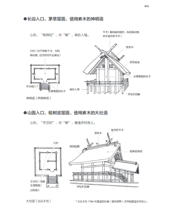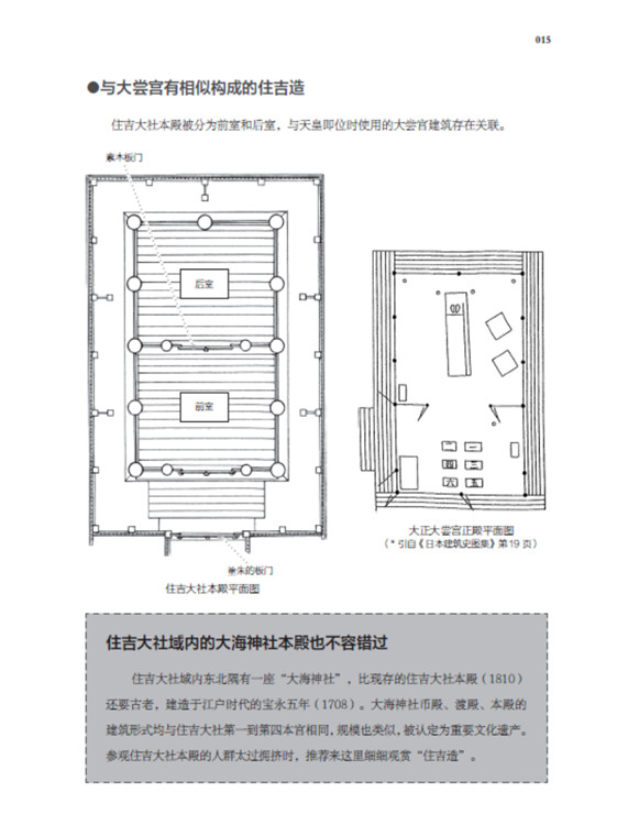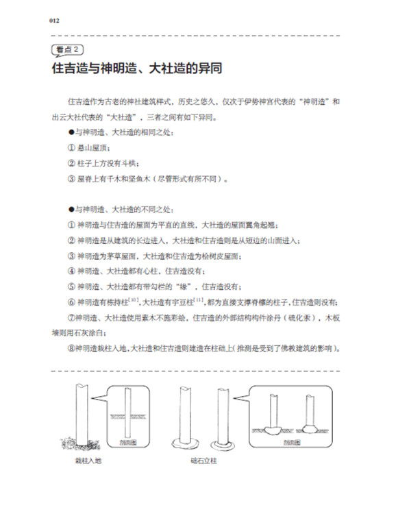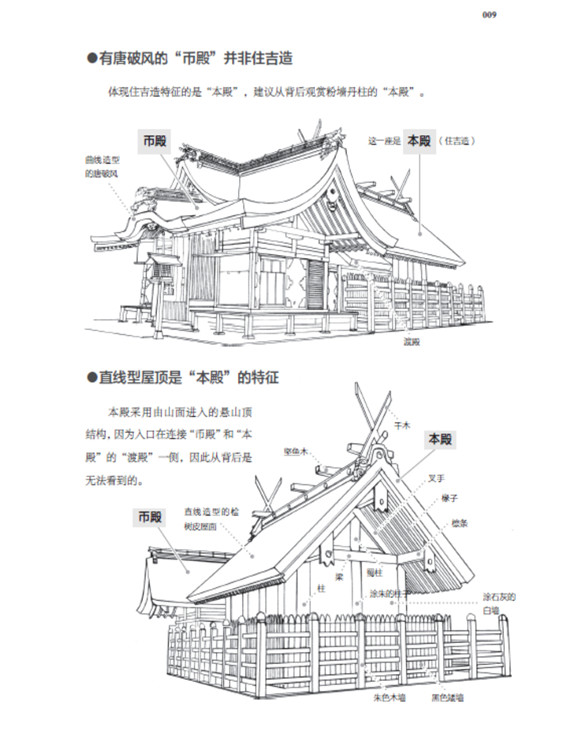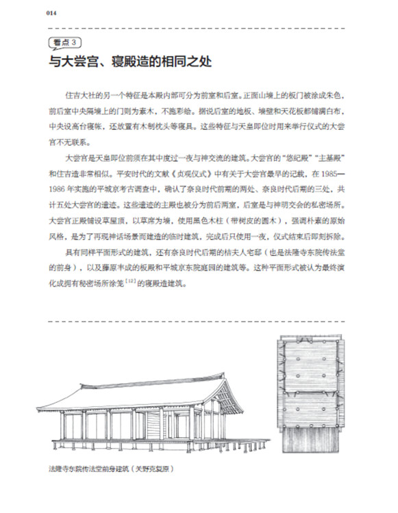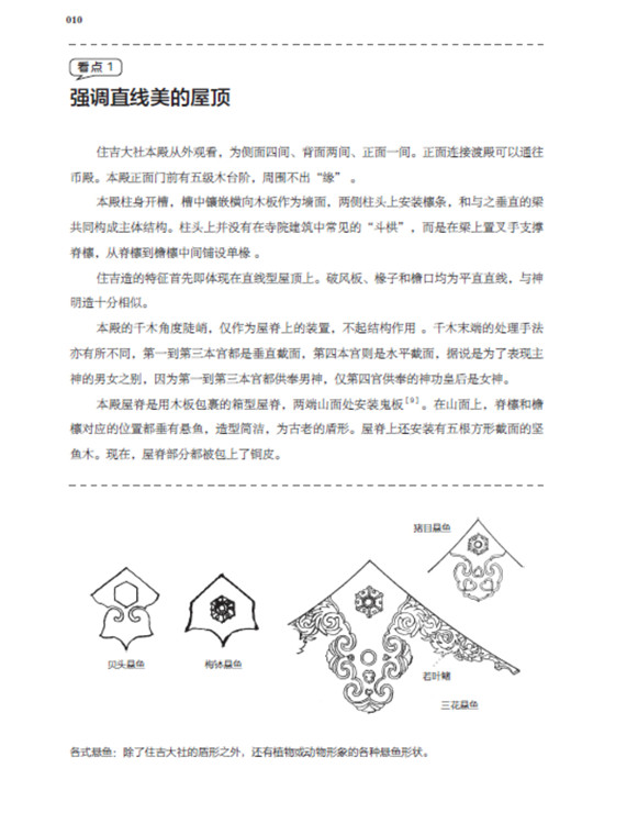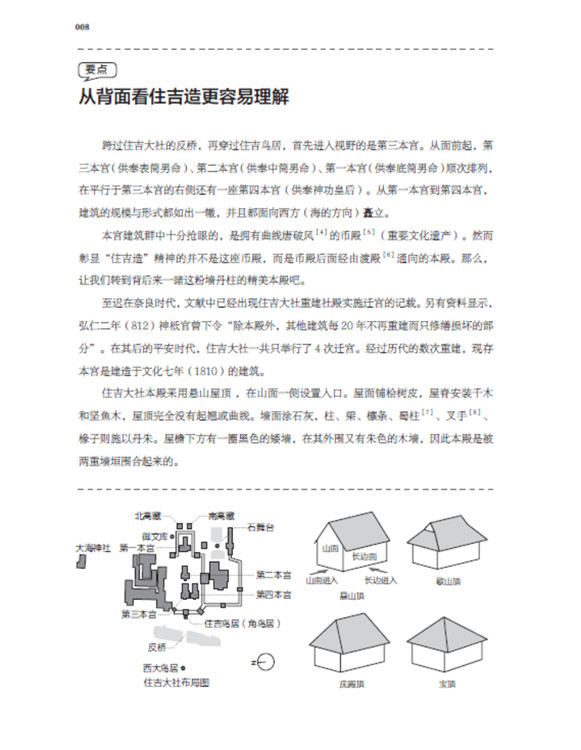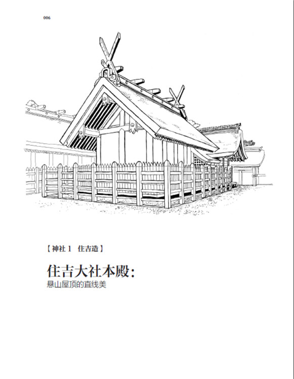 本書將日本古建筑中的神社、寺院、書院三部分,按照建筑樣式細分成住吉造、春日造、流造、日吉造、八坂造、飛鳥樣式、和式、大佛樣、禪宗樣、折中樣等14種建筑樣式在住吉大社本殿,領略懸山屋頂的直線美