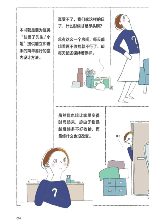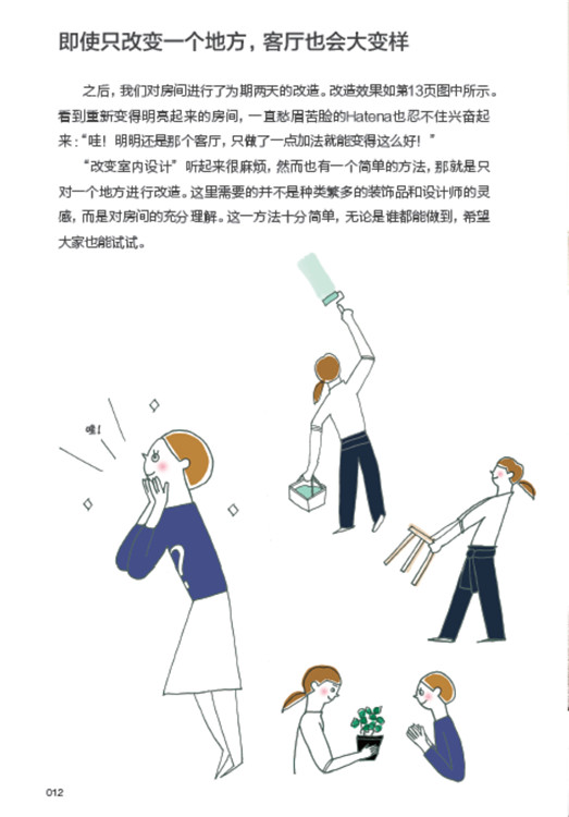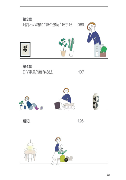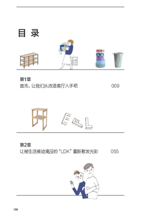 本書分為“首先,讓我們從改造客廳入手吧 ”“ 讓被生活痕跡淹沒的‘LDK’重新散發(fā)光彩”“ 對(duì)亂七八糟的‘那個(gè)房間’出手吧”“DIY家具的制作方法”四個(gè)章節(jié),以手繪漫畫的形式解說(shuō)詳細(xì)闡述了廚房、客廳、臥室、衛(wèi)生間、玄關(guān)等收納整理技巧和室內(nèi)設(shè)計(jì)創(chuàng)意,消除家中乏味的生活痕跡,讓改造后的家重新煥發(fā)光彩。