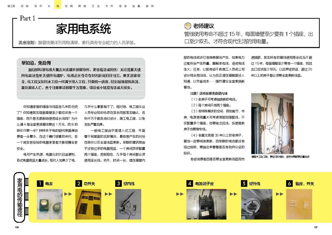 老師建議:管線使用壽命不超過15年,每面墻壁至少要有1個插座,出口至少雙孔,才符合現(xiàn)代生活的用電量。