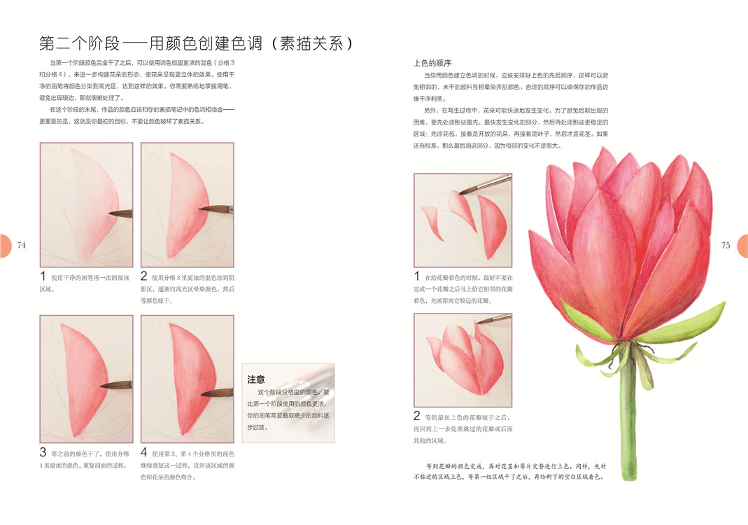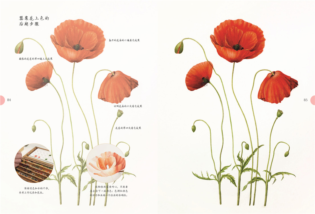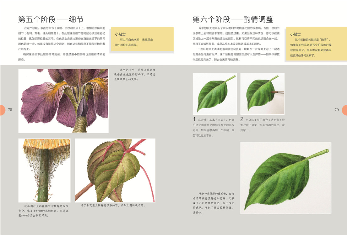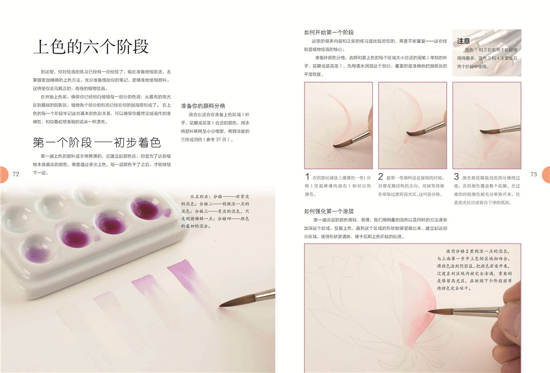 必備的畫(huà)前準(zhǔn)備后,是藝術(shù)家對(duì)造型和設(shè)色的講解,掃除你的入門(mén)疑慮。之后出場(chǎng)的是有充分詳解步驟的繪畫(huà)案例,玫瑰、馬蹄蓮、鳶尾……你肯定會(huì)喜歡。充分的練習(xí)后,需要反思總結(jié),藝術(shù)家在這里列出上色的六個(gè)階段,這有助于你更精準(zhǔn)地使用顏料,幫你走向真正的植物繪畫(huà)。