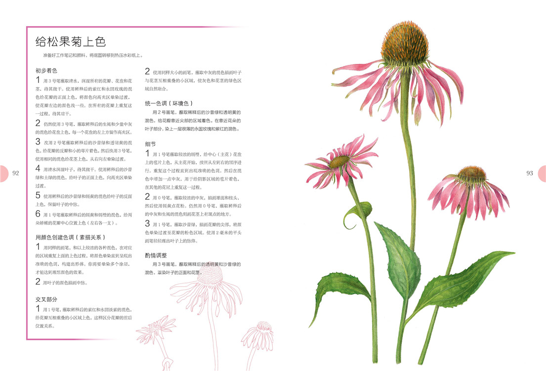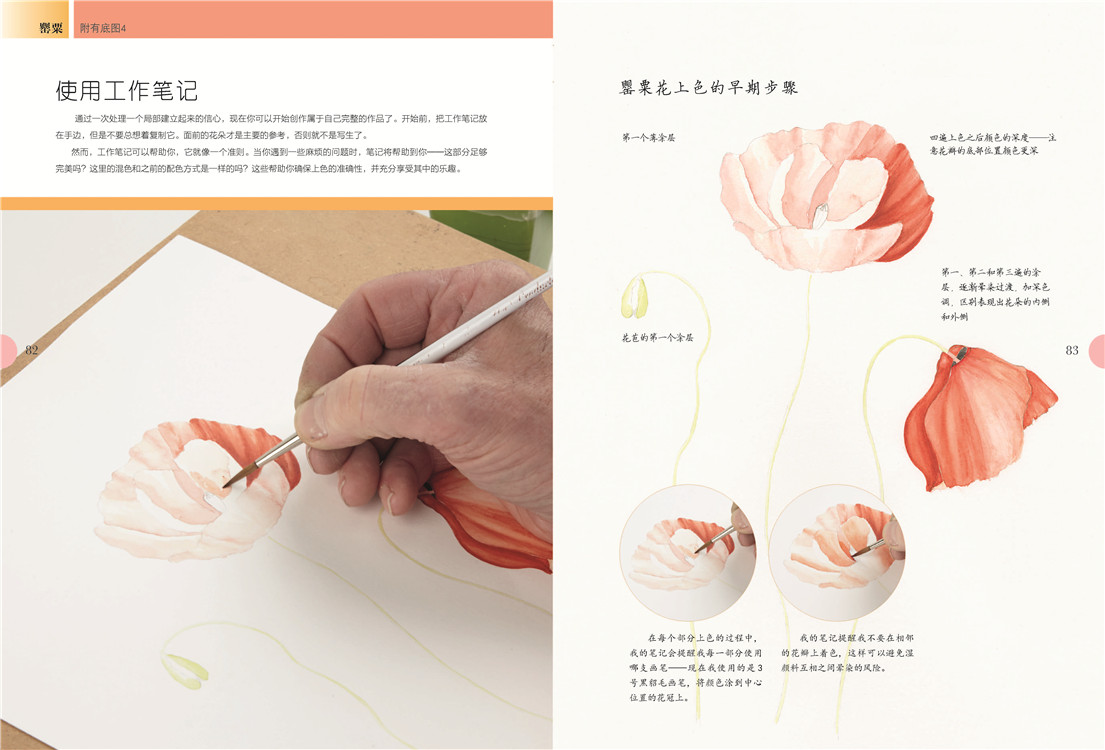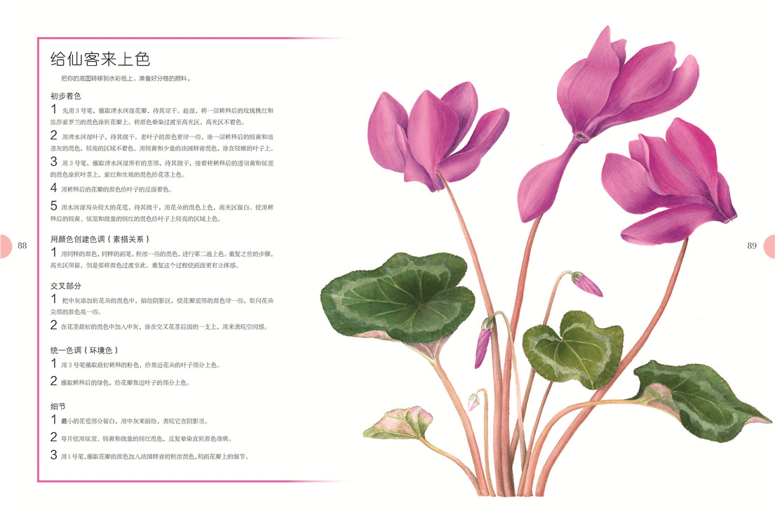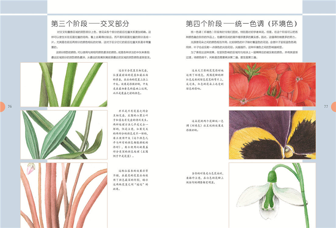 必備的畫(huà)前準(zhǔn)備后,是藝術(shù)家對(duì)造型和設(shè)色的講解,掃除你的入門(mén)疑慮。之后出場(chǎng)的是有充分詳解步驟的繪畫(huà)案例,玫瑰、馬蹄蓮、鳶尾……你肯定會(huì)喜歡。充分的練習(xí)后,需要反思總結(jié),藝術(shù)家在這里列出上色的六個(gè)階段,這有助于你更精準(zhǔn)地使用顏料,幫你走向真正的植物繪畫(huà)。