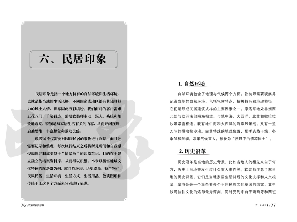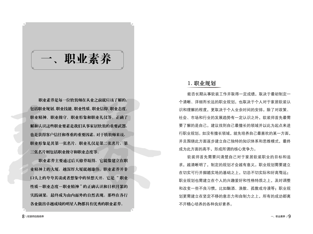該書詳細(xì)闡述了軟裝師在職業(yè)素養(yǎng)、生活體驗(yàn)、思維模式、藝術(shù)修養(yǎng)、心理研習(xí)等多方面所應(yīng)具備的基本素質(zhì),是一本關(guān)于軟裝師職業(yè)、責(zé)任與使命的工具書,也是一本軟裝師與生活和社會(huì)相結(jié)合、提升與完善藝術(shù)修養(yǎng)的基礎(chǔ)理論著作。