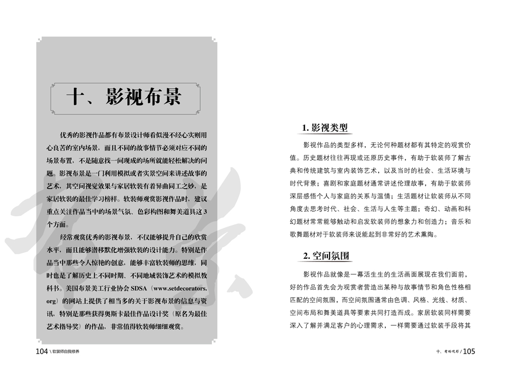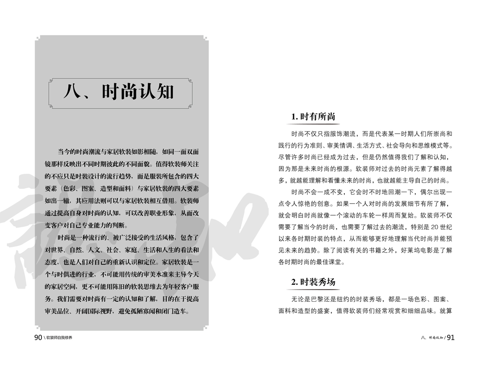 ①軟裝行業(yè)發(fā)展多年,呈現(xiàn)出良莠不齊的發(fā)展態(tài)勢(shì),雖然技巧類的社會(huì)培訓(xùn)很多,軟裝圖書也層出不窮,但很多學(xué)生反映片段化的知識(shí)結(jié)構(gòu)不易融會(huì)貫通,收獲一直不大。此書的出版能讓軟裝師有針對(duì)性地選擇學(xué)習(xí)方向,而不是盲從社會(huì)培訓(xùn)。
