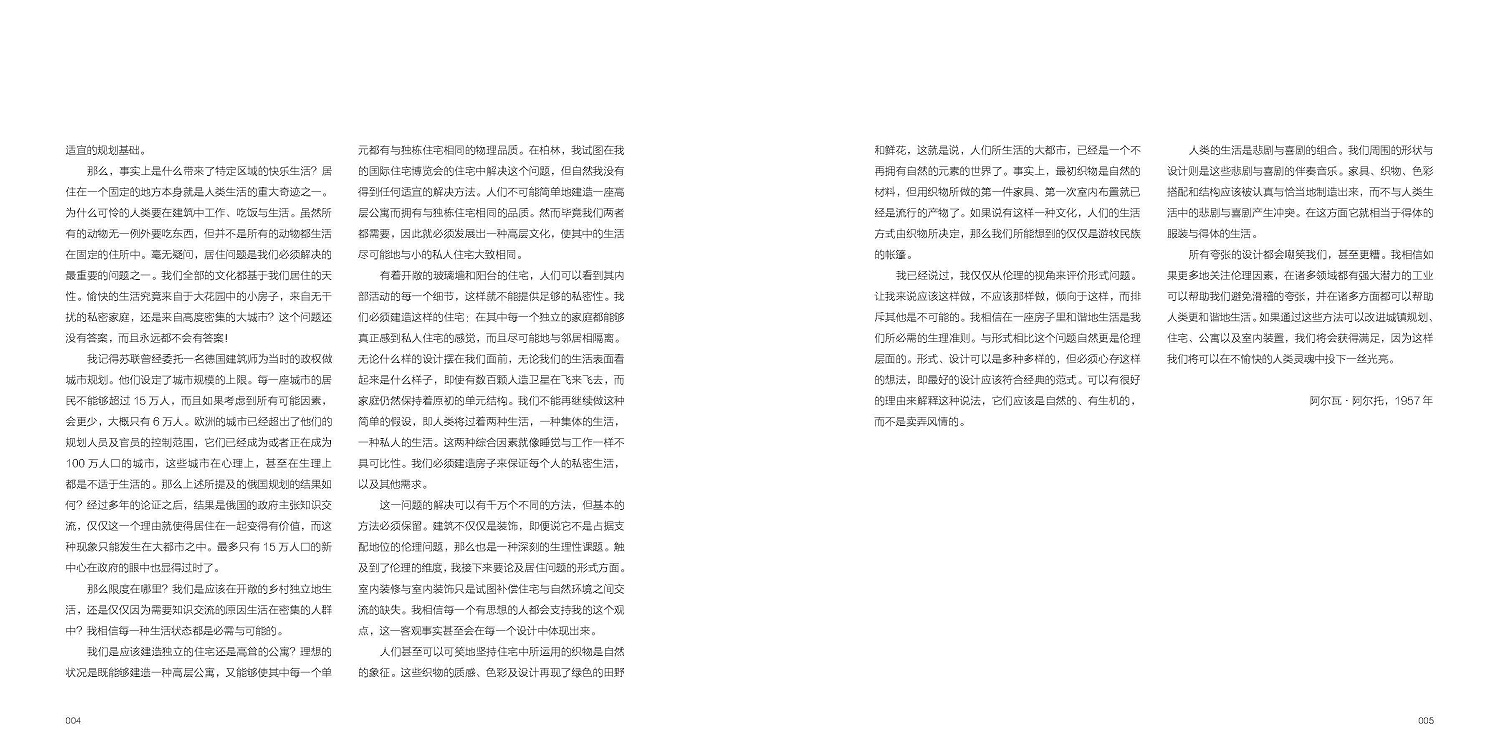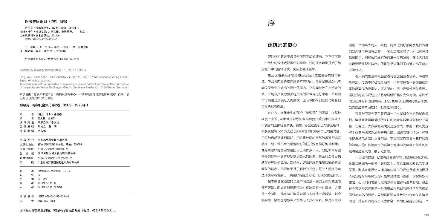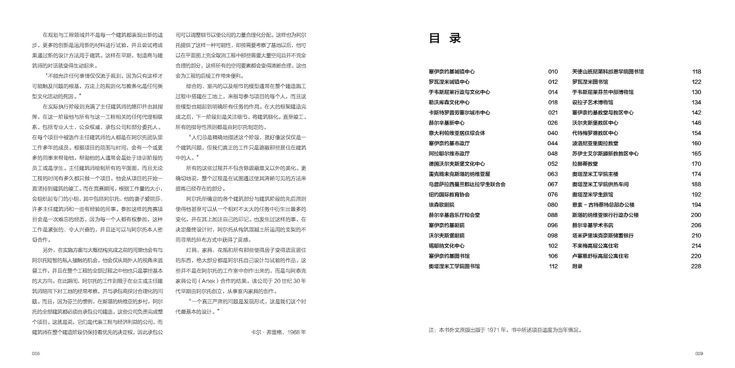 本卷外文原版出版于1971年,是這位大師作品集的第2卷,收錄從1963—1970年的建筑設(shè)計(jì)與規(guī)劃案例等,包括文化中心、劇院、博物館、圖書館和教堂等。在這一卷的原著籌備過程中,阿爾托當(dāng)成是自己的責(zé)任,毫無保留地奉獻(xiàn)所有。本書沒有將阿爾托的建筑設(shè)計(jì)歸類于某種風(fēng)格或流派,也沒有對(duì)他的作品小題大做,只是將他的建筑設(shè)計(jì)忠實(shí)、客觀、簡(jiǎn)要地展示與陳述給讀者。
