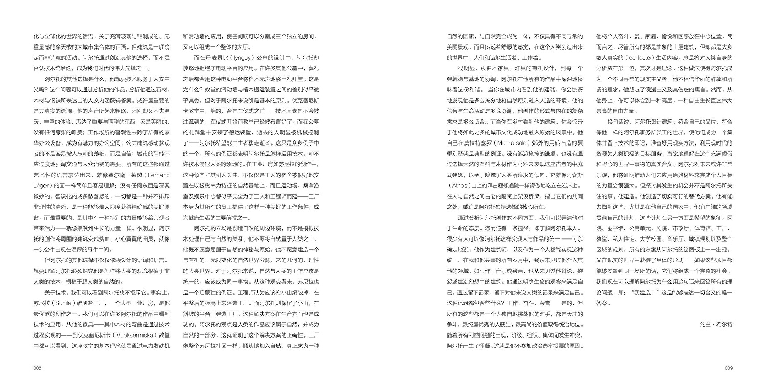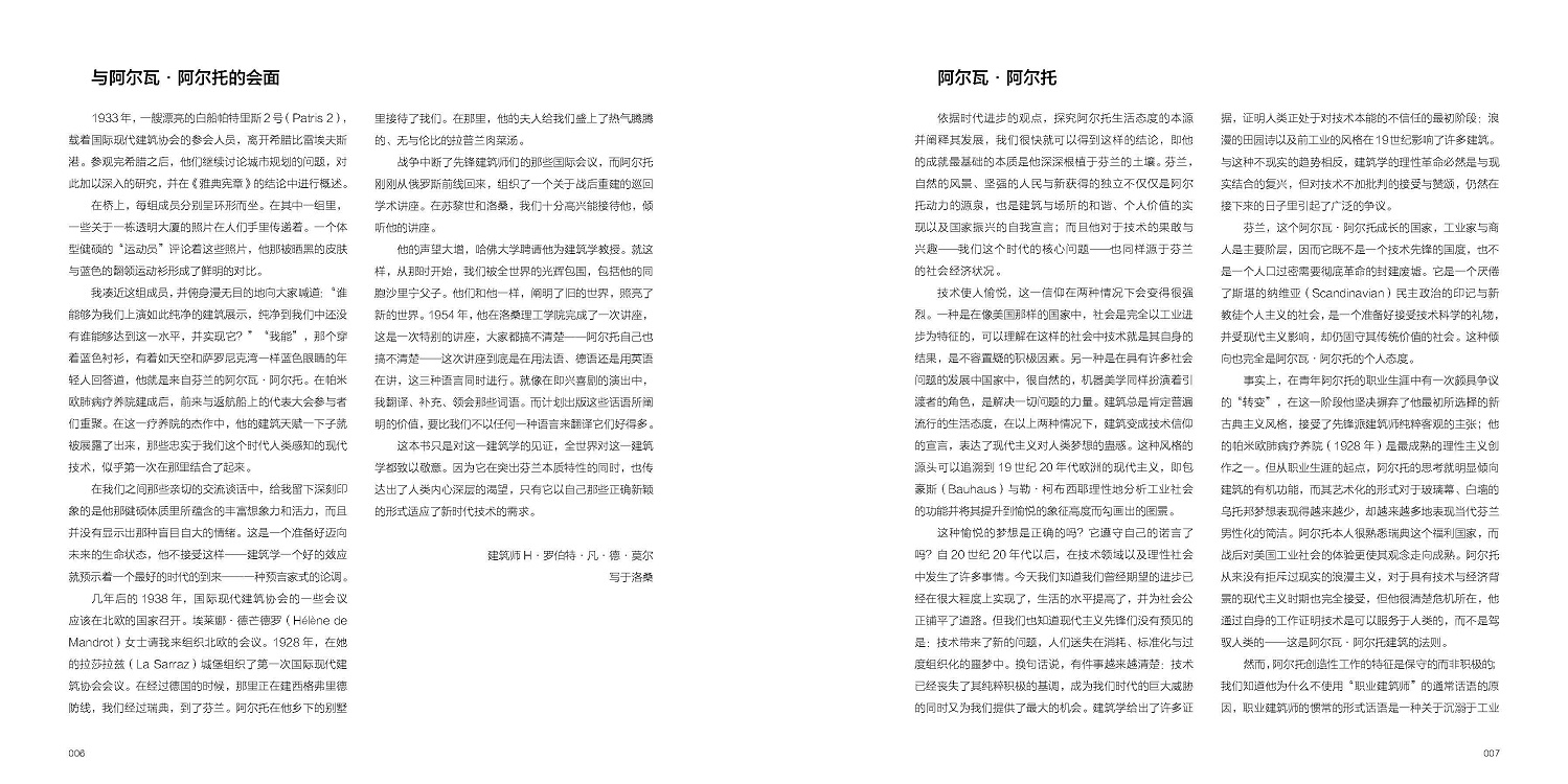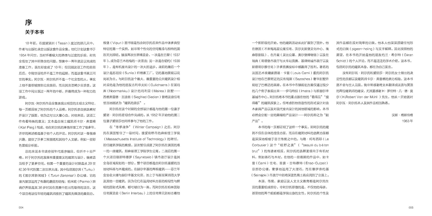 本卷外文原版出版于1963年,是這位大師作品集的第1卷,收錄從1922—1962年的建筑設(shè)計與規(guī)劃案例,從1929年建成位于圖爾庫的芬蘭劇院,到1962年的新赫爾辛基城市中心方案,通過280余張照片,近200張設(shè)計圖紙和草圖,按時間順序為讀者展示。本書并沒有將阿爾托的建筑設(shè)計歸類于某種風格或流派,也沒有對他的作品小題大做,只是將他的建筑設(shè)計忠實、客觀、簡要地展示與陳述給讀者。