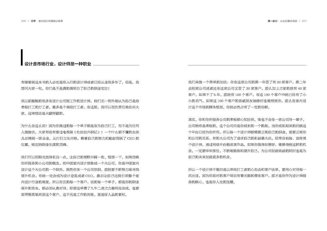 兒應(yīng)聘到一家企業(yè),從打掃衛(wèi)生開始,靠著自己的努力和勤奮爬到了CEO 的位置,到達(dá)她職業(yè)生涯的頂峰。我們可以把眼光放得長(zhǎng)遠(yuǎn)一點(diǎn),讓自己的視野開闊一些。假想一下,如果忽略你所服務(wù)的小公司的概念,把中國(guó)室內(nèi)設(shè)計(jì)想象成一個(gè)大公司,你是中國(guó)室內(nèi)設(shè)計(jì)這個(gè)大公司的一個(gè)職員。既然你在一個(gè)公司供職,那就要不斷努力地尋找晉升機(jī)會(huì),你就一定會(huì)成為設(shè)計(jì)總監(jiān)或者CEO,最后讓自己達(dá)到引領(lǐng)整個(gè)室內(nèi)設(shè)計(jì)行業(yè)的高度。所以你見的每一個(gè)客戶、談的每一個(gè)單子,都是你的職業(yè)晉升的資本,都必須認(rèn)真對(duì)待。即使這單費(fèi)了九牛二虎之力最終沒談成,也要面帶微笑地歡送這個(gè)客戶。這不光是工作的歷練,更是好人品的累積。我們來(lái)做一個(gè)簡(jiǎn)單的加法:你在這家公司的第一年簽了有20 家客戶,第二年去別家公司或者還在這家公司又簽了20 家客戶,那么加上之前的就有40 家客戶,如果干了5 年,那就有100 個(gè)客戶,在這100 個(gè)客戶中就已經(jīng)有了小小的名氣。如果這100 個(gè)客戶的親戚朋友裝修時(shí)也能想到你,那么在室內(nèi)設(shè)計(jì)這個(gè)市場(chǎng)的群體里面,你就必然占有了一定的份額。