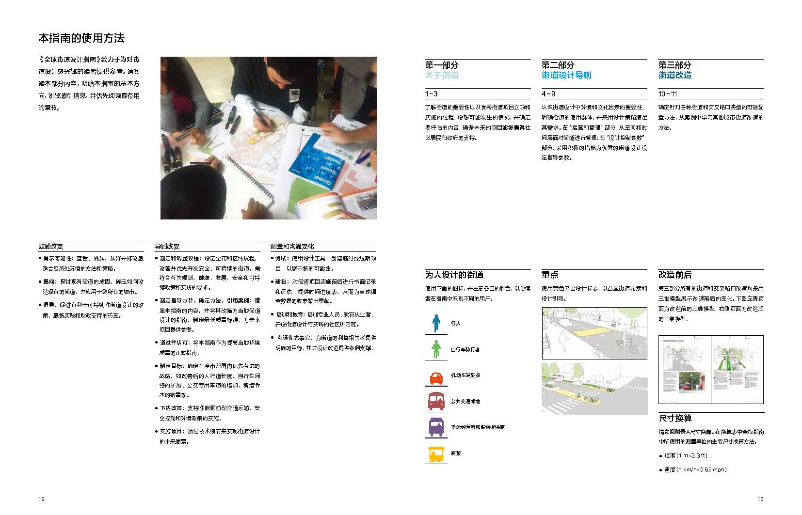 全書總共分為三個(gè)部分:關(guān)于街道、街道設(shè)計(jì)導(dǎo)則和街道改造。第一部分“關(guān)于街道”,重新定義了街道以及街道設(shè)計(jì)的一些基本原則,顛覆了街道設(shè)計(jì)的一些舊有知識(shí)體系和結(jié)構(gòu)認(rèn)知。第二部分“街道設(shè)計(jì)導(dǎo)則”,針對(duì)街道的使用對(duì)象,從需求出發(fā),分析街道設(shè)計(jì)要素,采用量化、圖例化的方式來解析各要素的設(shè)計(jì)特點(diǎn),從而展示不同使用對(duì)象的本質(zhì)特征,并以此作為設(shè)計(jì)的出發(fā)點(diǎn)和依據(jù)。第三部分“街道改造”,引入具體案例,通過綜合分析典型案例中各設(shè)計(jì)要素的組合方式來總結(jié)、分享成功設(shè)計(jì)的實(shí)踐經(jīng)驗(yàn),為讀者提供參考和學(xué)習(xí)依據(jù)。