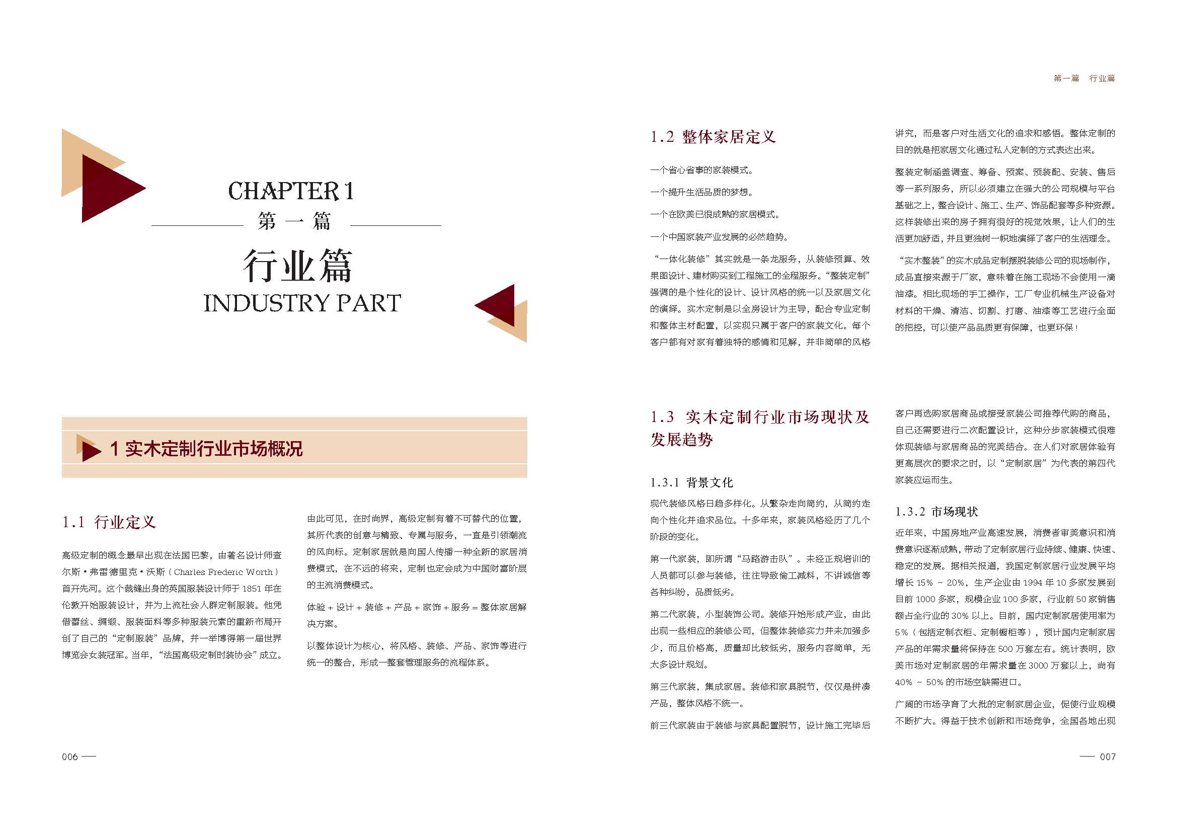 本書分九章分別由淺入深地講解整木定制設(shè)計。第一章,實木定制行業(yè)市場概況。第二章,產(chǎn)品篇。講解木門、實木定制整體櫥柜、實木護(hù)墻板、實木吊頂天花、實木樓梯等整木設(shè)計相關(guān)產(chǎn)品的特性及應(yīng)用。第三章,設(shè)計篇。介紹實木定制設(shè)計的風(fēng)格、定制空間測量、設(shè)計流程等相關(guān)內(nèi)容。第四章,計價篇。介紹實木定制產(chǎn)品的計價方法。第五章,安裝篇。第六章,崗位篇。介紹設(shè)計總監(jiān)、木作設(shè)計師的崗位職責(zé)。第七章,營銷篇。介紹銷售人員的基本素質(zhì)和營銷技巧。第八章,材料篇。介紹木器涂料的選用和涂裝工藝。第九章,質(zhì)量判斷和品牌定位篇。